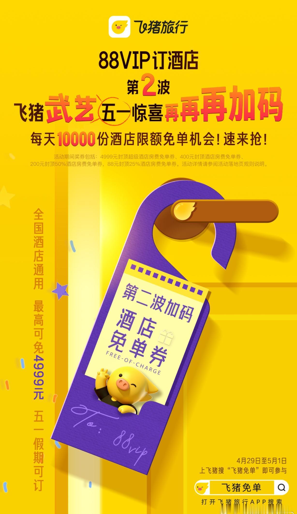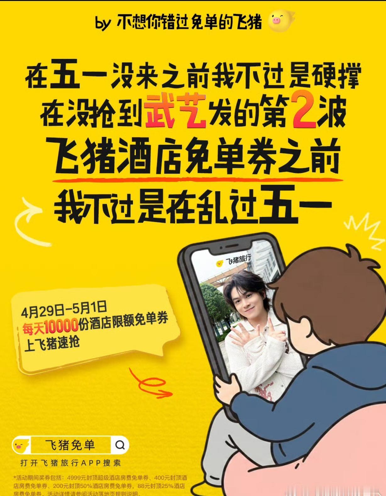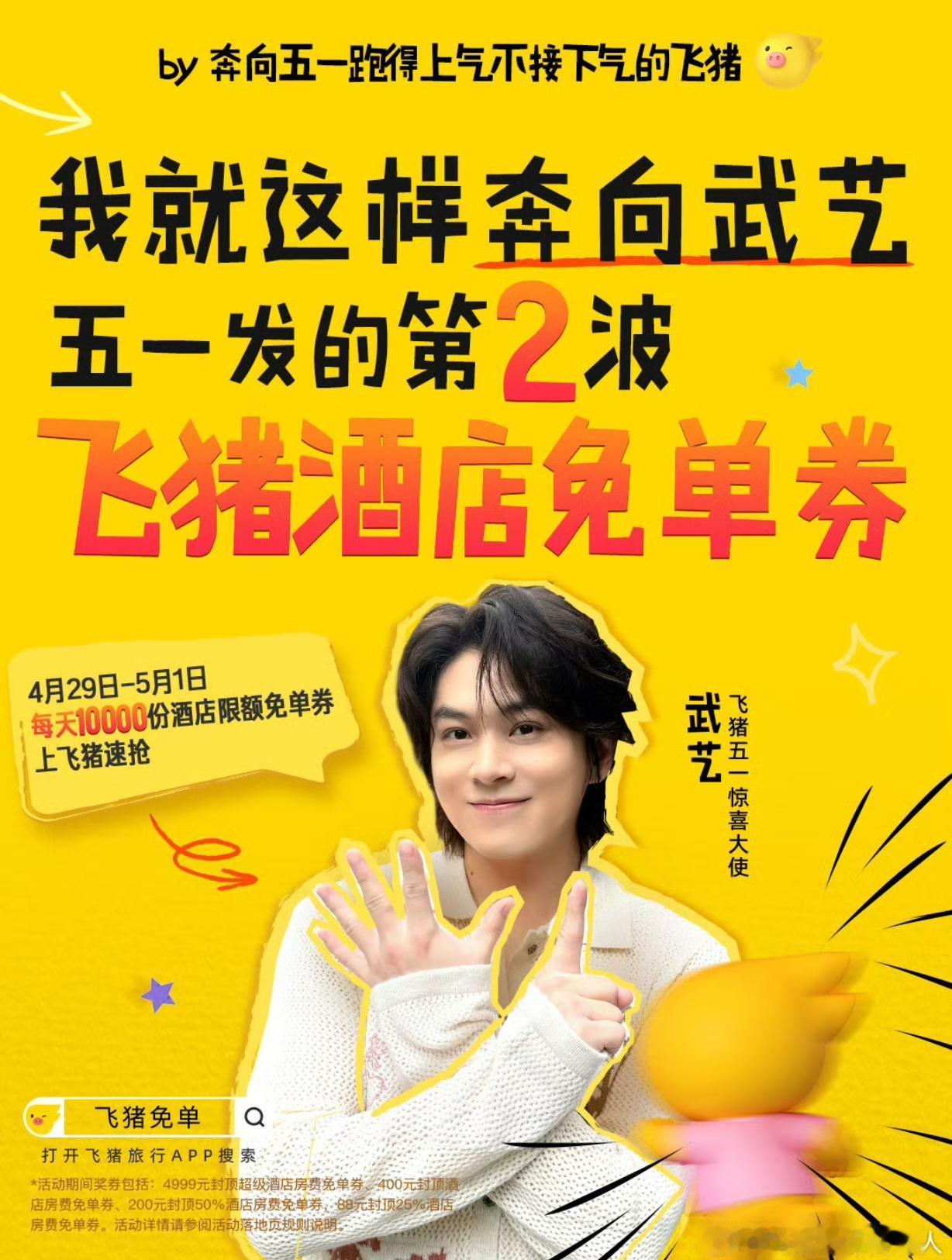 [打call]等五一,盼五一,念五一,迎五一,爱五一 ——抢五一武艺第二波特别加码的每天10000份酒店限额免单券!飞猪五一免单送送送送送送送 武艺表情包就代表本猪猪此刻的心情:距离五一还有两天,飞猪五一惊喜大使武艺再次返场[老师夸夸]:现在上飞猪搜【飞猪免单】,4月29日至5月1日压哨出行前再抢一轮酒店免单,就问你惊喜不惊喜![666] 准备好奔向五一的大家千万别错过!毕竟错过今年的武艺,还得再等明年五一……