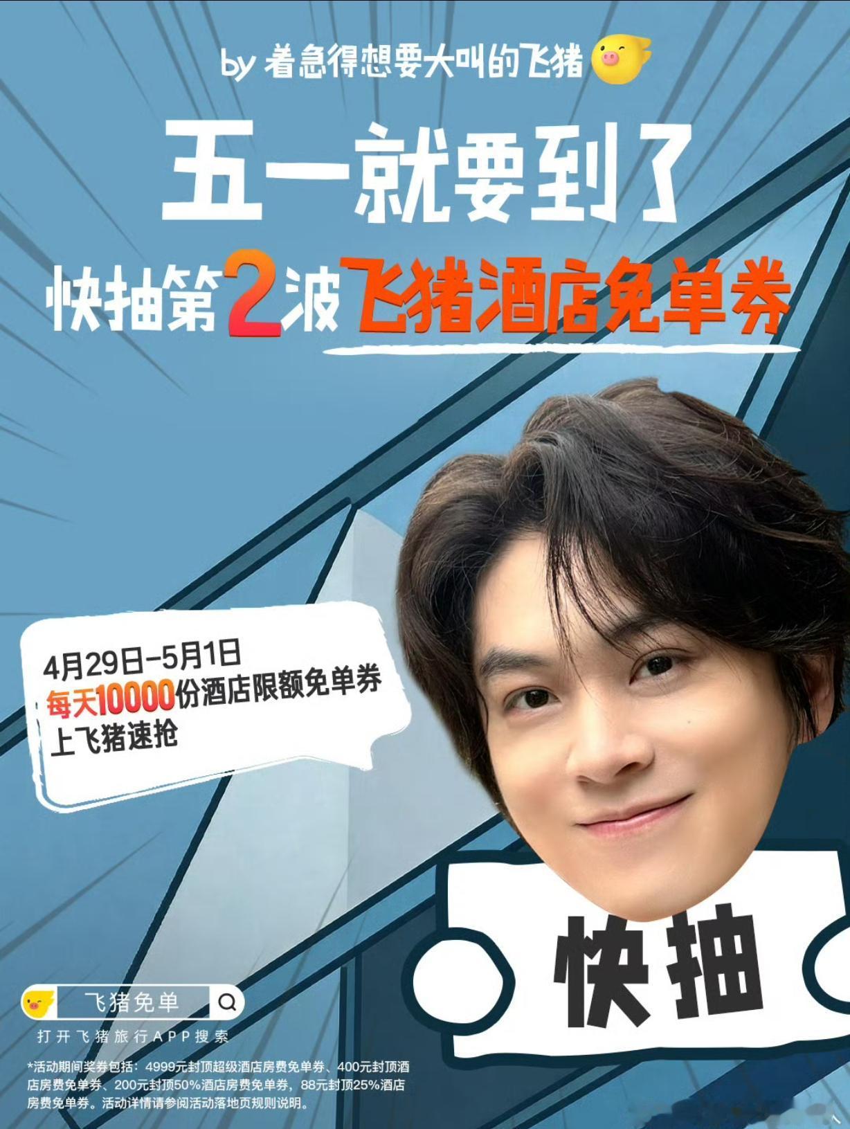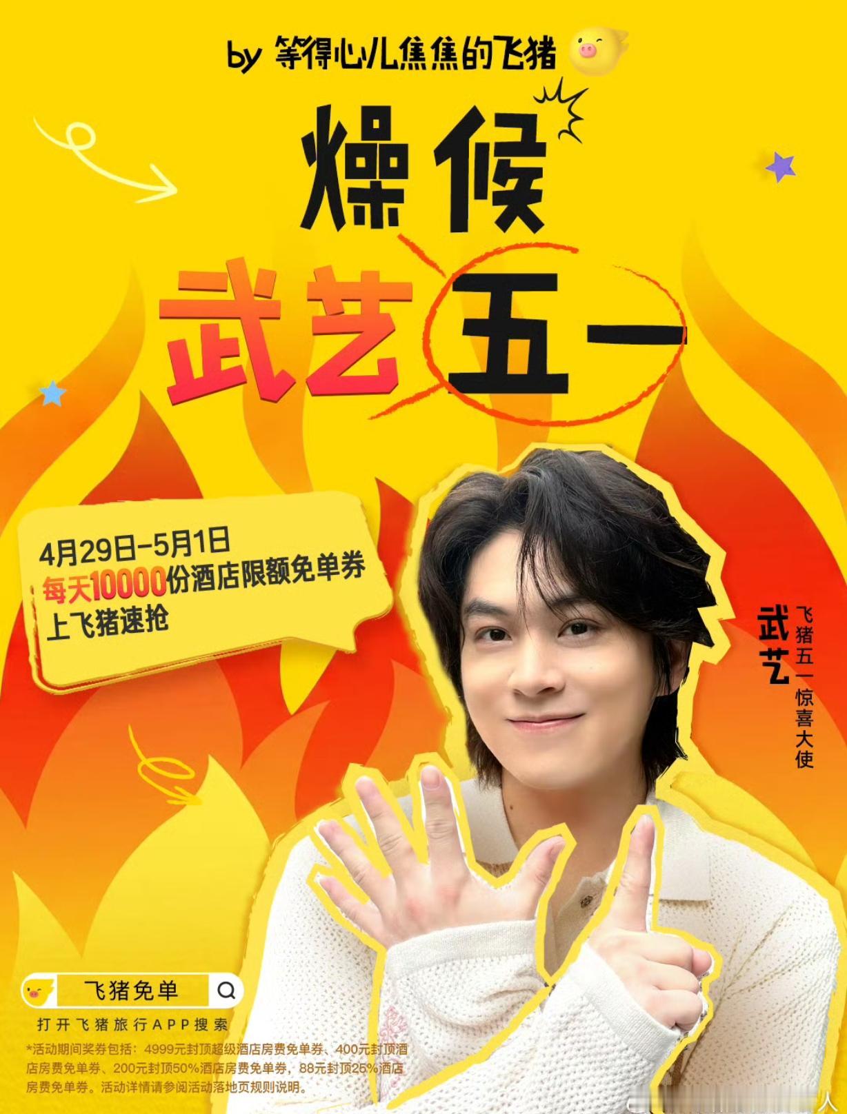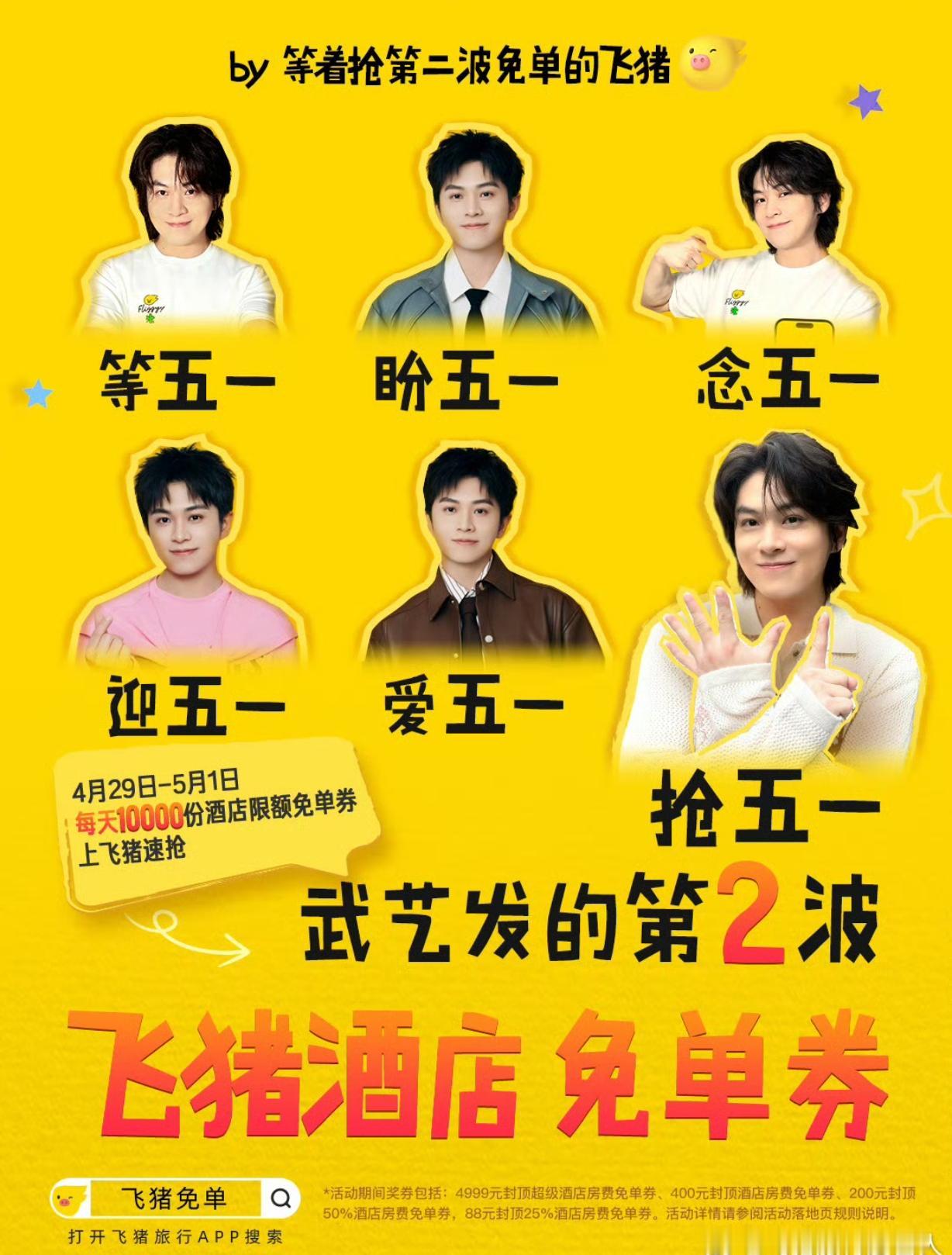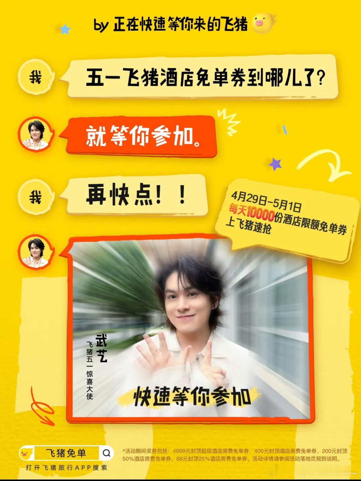 [打call]等五一,盼五一,念五一,迎五一,爱五一 ——抢五一武艺第二波特别加码的每天10000份酒店限额免单券!飞猪五一免单送送送送送送送 武艺表情包就代表本猪猪此刻的心情:距离五一还有两天,飞猪五一惊喜大使武艺再次返场[老师夸夸]:现在上飞猪搜【飞猪免单】,4月29日至5月1日压哨出行前再抢一轮酒店免单,就问你惊喜不惊喜![666] 准备好奔向五一的大家千万别错过!毕竟错过今年的武艺,还得再等明年五一……