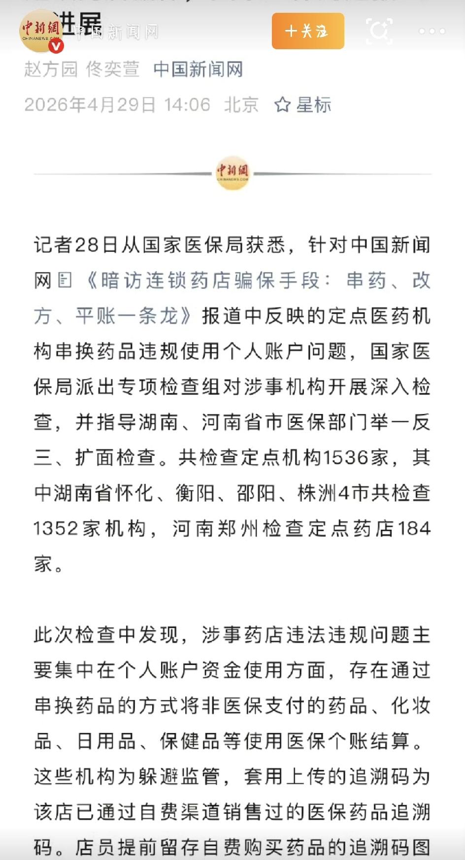 咱老百姓手里的医保卡,是用来买药看病的“救命卡”。可偏偏有些连锁药店动起了歪脑筋,打起了医保基金的主意。最近,中国新闻网暗访曝光了药店骗保的黑幕:串药、改处方、私下平账,一套操作玩得挺溜。这事一出,国家医保局立刻高度重视,4月28日正式通报了查办进展,给大伙一个交代。 事情的起因不复杂。中新网记者在湖南、河南等地暗访多家连锁药店发现,不少定点医药机构存在严重违规行为。说白了,就是把保健品、生活用品甚至化妆品,违规串换成能报销的药品,帮着顾客用医保卡里的钱“买”这些东西。更过分的还有伪造处方、私下平账,把骗保做成了一条龙服务。这些钱都是咱们自己和单位缴的,实打实的看病钱、救命钱,哪能这么被糟蹋? 针对曝光的问题,国家医保局第一时间出手:派出专项检查组,直奔涉事药店深入调查,不放过任何细节。同时指导湖南、河南两地医保部门,不光要严查被曝光的门店,还要举一反三,对当地所有定点药店全面排查,绝不让类似现象漏网。 目前,两地医保部门已经快速行动:紧急约谈了涉事连锁药店的总部负责人,对查实违规的药店,第一时间暂停医保结算资格,追回套取的医保资金。初步核查显示,涉事的十家药店主要违规使用了职工个人账户的钱,暂未涉及医保统筹基金。相关整改和核查还在继续推进。 国家医保局也明确表态:绝不姑息。后续将严格按照《零售药店医疗保障定点管理暂行办法》处理——情节轻的,责令整改、从严处罚;情节严重的,直接解除医保服务协议,取消定点资格,让它们再也别想钻空子。 医保基金是全体参保人共同的“钱袋子”,每一分都关系着大家的看病保障。这次国家医保局快速出手严查,就是为了堵住漏洞,守护好咱老百姓的救命钱。也提醒所有定点药店引以为戒,合规经营;大家如果发现违规行为,欢迎及时举报,一起维护好医保基金的安全。 来源:中国新闻网