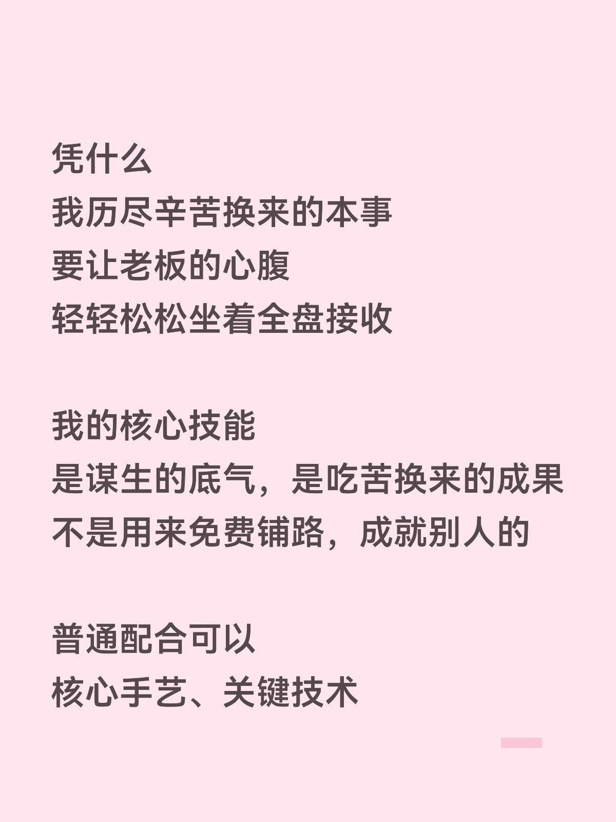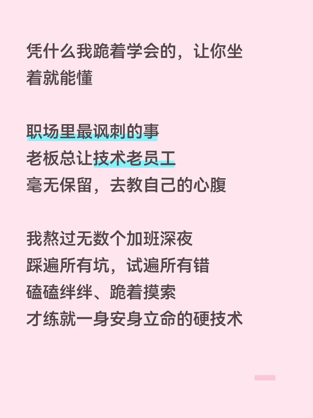 凭什么我跪着学会的,让你坐着就能懂职场里最讽刺的事 老板总让技术老员工 毫无保留,去教自己的心腹 我熬过无数个加班深夜 踩遍所有坑,试遍所有错 磕磕绊绊、跪着摸索 才练就一身安身立命的硬技术 凭什么 我历尽辛苦换来的本事 要让老板的心腹 轻轻松松坐着全盘接收 我的核心技能 是谋生的底气,是吃苦换来的成果 不是用来免费铺路,成就别人的 普通配合可以 核心手艺、关键技术 绝不倾囊相授 成年人的职场 留一手,才是自保 免费渡人,最后只会被逼退场💔