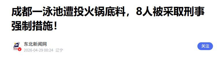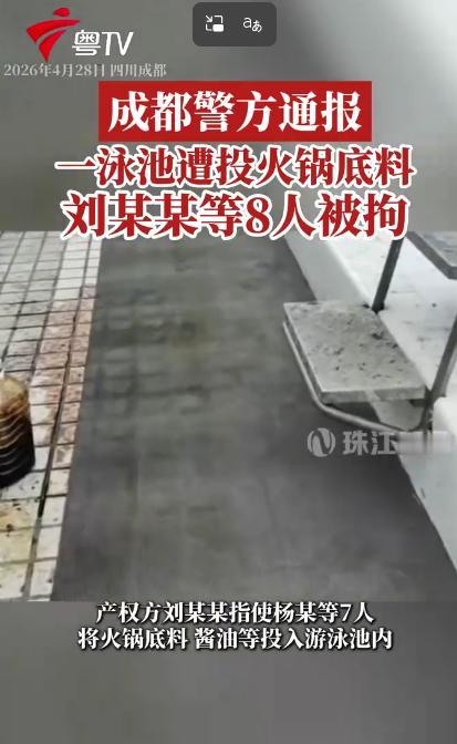 4月27日,成都一帮人干了一件让人哭笑不得的事。因为游泳池租赁纠纷,场地产权方直接喊了7个人,拎着火锅底料和酱油就往人家池子里倒,倒完就跑。好好的游泳池瞬间变成了一锅“红汤”。后来一化验,倒的东西没毒,但这8个人全都被抓进去了。网友:得不偿失! 4月28日,成都警方通报了一件离谱又好笑的事,8名男子被依法采取刑事强制措施,蹲进了看守所。谁能想到,这8个人之所以被抓,不是因为伤人,也不是因为偷抢,仅仅是因为一场泳池租赁纠纷,一时冲动干了件蠢事,最后得不偿失。 说出来你可能都不信,这8个人里,有1个是泳池的产权方,另外7个是他特意喊来的人。原本只是简单的租赁矛盾,好好商量或者走正规途径就能解决,可他们偏不,非要用最极端、最荒唐的方式泄愤,最后把自己送进了局子。 事情的起因,就是泳池产权方和承租方闹了矛盾,双方因为租赁相关的事宜谈不拢,产权方心里越想越气,觉得自己吃了亏,又不想好好沟通,就琢磨着要给承租方一个教训,让对方知道自己的厉害。 思来想去,产权方居然想出了一个奇葩到不行的主意——往泳池里倒火锅底料和酱油。他特意找来了7个熟人,每人拎着几袋火锅底料、几瓶酱油,趁着凌晨大家都在熟睡、没人注意的时候,偷偷摸到了泳池边上。 4月27日凌晨1点多,这8个人分工明确,有人负责望风,有人负责拆开火锅底料和酱油,一股脑地往干净的泳池里倒。红彤彤的火锅底料融化在水里,再加上黑乎乎的酱油,好好的一池清水,瞬间变成了一锅“红汤”,看着又滑稽又离谱。 倒完之后,这8个人生怕被人发现,不敢多做停留,撒腿就跑,心里还暗暗得意,觉得自己出了一口恶气,承租方肯定会被气得跳脚。他们压根没多想,自己这种行为,已经触犯了法律,等待他们的不会是“解气”,而是处罚。 当天早上7点左右,泳池的工作人员上班后,一看到泳池的样子,瞬间懵了。原本清澈见底的泳池,变得浑浊不堪,红黑相间,还飘着火锅底料的残渣,散发着奇怪的味道,根本没法正常营业,工作人员赶紧报了警。 警方接到报警后,很快就赶到了现场,对泳池的水质进行了勘验取样,还送到专业机构进行检测。让人意外的是,检测结果显示,倒进去的火锅底料和酱油没有毒,不会对人体造成伤害,但这并不代表他们的行为就合法。 警方顺着现场留下的线索,一点点排查,很快就锁定了产权方和另外7名涉案人员,没过多久,就把这8个人全部抓获归案。面对警方的询问,他们也没什么可辩解的,老老实实地交代了自己的所作所为。 原本只是一场普通的租赁纠纷,哪怕谈不拢,也能通过协商或者法律途径解决,可这8个人偏偏选择用极端方式泄愤。倒进去的东西虽然没毒,却污染了泳池,导致泳池无法正常营业,造成了不小的经济损失,也扰乱了正常的社会秩序。 这件事传开后,网友们都笑疯了,纷纷调侃这8个人是“蠢得离谱”,本来占理的事,硬生生被自己搞成了违法的事。好好的日子不过,非要一时冲动逞能,最后不仅要承担泳池的清理、维修费用,还要面临法律的制裁,纯属得不偿失。 对此,你们有什么看法,欢迎评论留言~