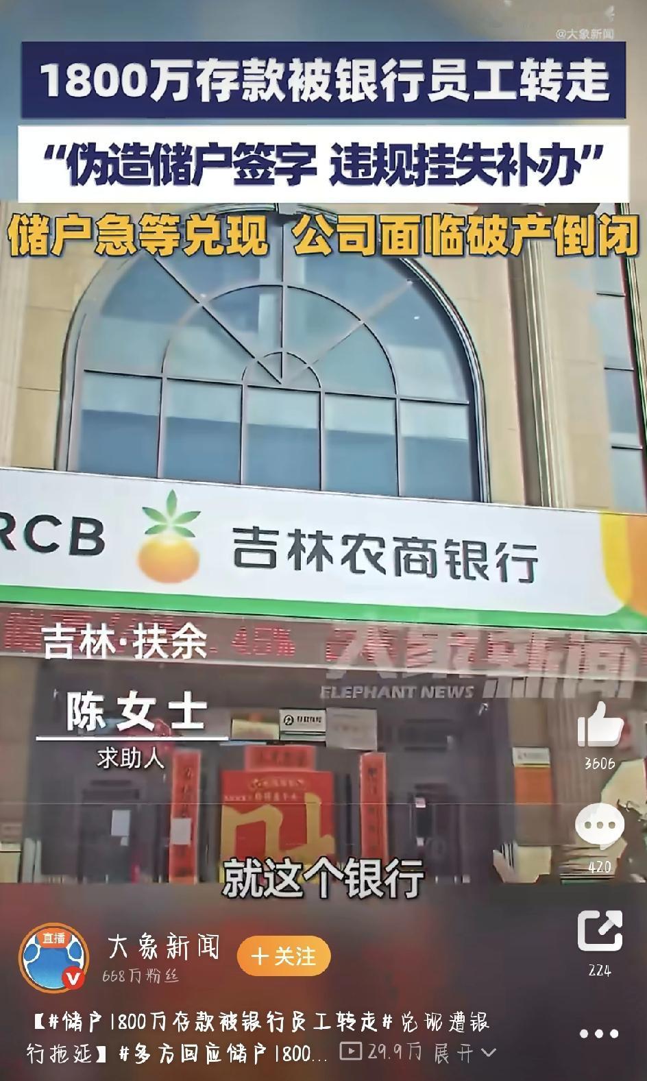 1800万存款被银行员工转走,储户维权难——我们的钱袋子,到底谁来管? 把钱存进银行,本来是老百姓最放心的理财方式。可吉林这两位储户的遭遇,真让人后背发凉。半年前,陈冰在吉林省扶余市的扶余惠民村镇银行存了1000万,没多久,这笔巨款竟莫名其妙没了;同一家银行的另一位储户王凤,800万存款也不翼而飞。两人加起来1800万,全被银行员工私下转走了。这事一出,全网炸了锅,而银行的态度更是让人既生气又无奈。 事情要从2025年10月说起。陈冰为了资金安全,特意在这家银行办了1000万的七天通知存款,银行卡和身份证一直自己贴身收着,从没离过手。可一个多月后,她发现手机银行登不上了,跑去银行一查,当场崩溃——她的卡被人挂失后补办了,1000万全转到了银行员工赵某丽的账户里。更离谱的是,挂失、补卡、转款需要的所有签名,全是赵某丽伪造的,陈冰本人压根没到场。 没过多久,另一位储户王凤也遭了殃。2025年11月,她在这家银行存了800万,2026年1月就发现存单被挂失,钱被转得一分不剩。干的还是同一个赵某丽。原来赵某丽早就盯上了这两位储户,之前用高息揽储当诱饵,摸清了她们的资金底细,然后借着银行员工的身份,钻了银行内控的空子,把储户的钱当成了自己的私房钱,转走去炒股了。 事发后,两位储户一次次找银行维权,过程却异常艰难。2025年12月,扶余惠民村镇银行已经被吉林农商银行合并,可两家银行互相推起了责任。2026年初,吉林农商银行曾承诺7天内让赵某丽把钱还回来,可7天一过,钱没到账,反倒传来赵某丽试图轻生的消息。目前她已被警方控制。 到了3月16日,涉事银行工作人员的说法更让人寒心,只说自己查下来确认赵某丽违规,经侦正在调查,必须等“司法结论”出来,才能处理储户的存款问题。可“司法结论”到底是什么,他们却含糊其辞,只让储户自己去问公安。国家金融监督管理总局吉林监管局也表示,已经把这起事件纳入金融违法线索认定程序,但监管部门只能协调督促,没法强制银行立刻赔钱。 律师对此明确表示:赵某丽的行为属于职务侵占,侵害的是银行的利益;储户和银行之间签了储蓄合同,要求银行还钱完全合法,银行以案件没定论为由拒绝支付,根本站不住脚。可即便如此,陈冰和王凤的1800万至今没有着落。陈冰的企业因为这笔钱流失,连员工工资都快发不出来了,面临倒闭的风险。 截至现在,两位储户还在焦急地等待。1800万存款何时能找回?企业能不能撑下去?普通百姓的存款安全到底该由谁来保障?这些问题,全都没有答案。大象新闻记者表示会持续跟踪事件进展。 银行本该是守护老百姓钱袋子的地方,可这次事件暴露出来的内控漏洞、监管缺失,还有银行的推诿态度,让大家对存款安全越来越不放心。希望相关部门能尽快查清事实,给储户一个公平的结果;也希望银行能真正引以为戒,把管理上的窟窿补上,别再让老百姓的救命钱、养老钱,因为内部员工的胡作非为打了水漂。 来源:大象新闻