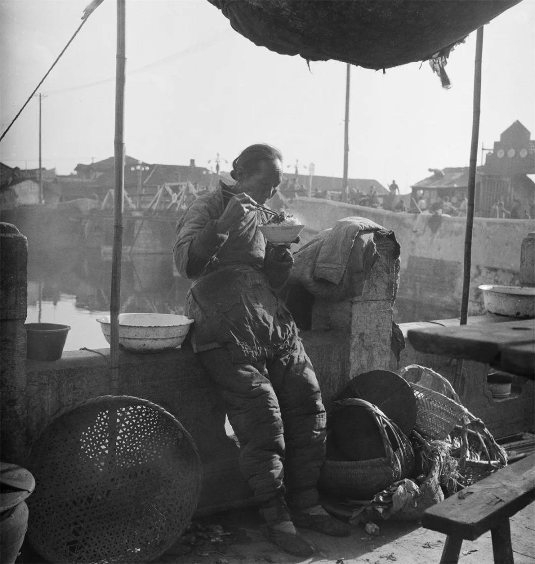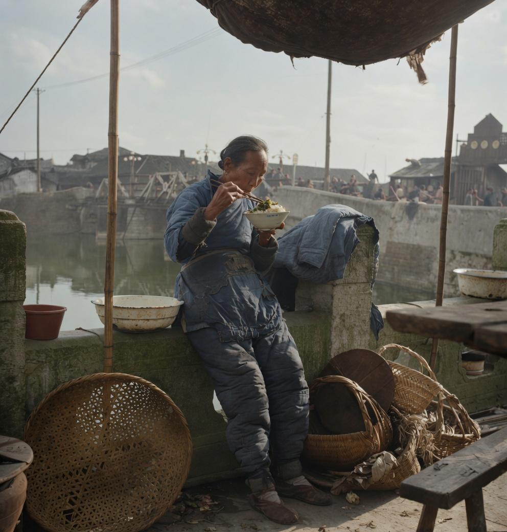 民国,江南水乡的河边,一位老年女性,衣服破得不成样子,靠在石栏上吃饭,身边都是干活的篮子,连一顿安稳饭都吃不上。 她可能是码头零工、洗衣妇、拾荒者,战乱、灾荒、失业让大量底层百姓只能靠码头零工、拾荒、小营生糊口,没有固定居所与灶台,吃饭、休息都只能在街头、河边解决。
