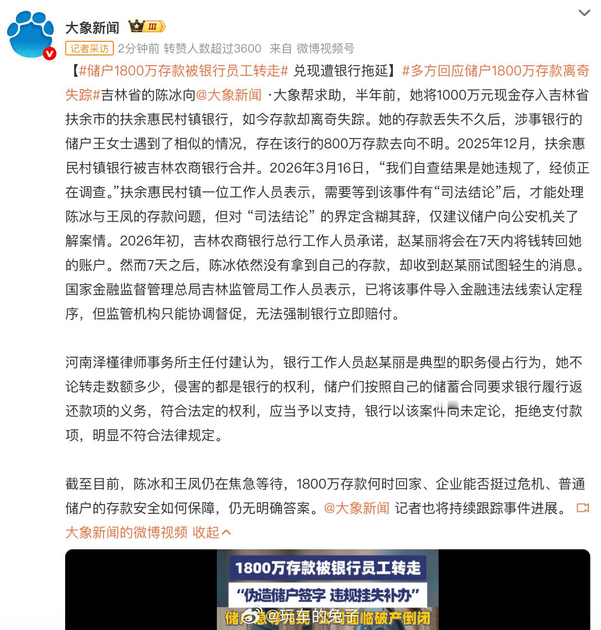 储户1800万存款被银行员工转走 把钱存进银行,储户是跟银行打交道,不是跟某个员工打交道。现在的处理逻辑,却变成了员工出事→在查→你先等等。问题是,这1800万对储户来说不是数字,而是现金流,是企业能不能活下去的命。你让他等司法结论,本质就是把银行内部的问题,转嫁给了储户。更关键的一点,是钱在银行体系内被转走的,那责任就应该由银行先兜底,然后再去追究内部人员的责任,而不是反过来让储户承担不确定性。如果连最基础的存钱进银行,都要承担这种风险,那普通人还能信什么金融安全?说白了,储户只认银行,银行就应该对风险兜底,对结果负责。