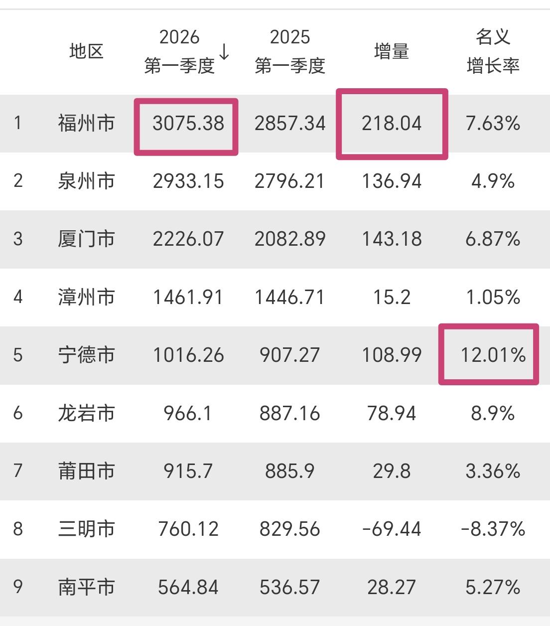 【2026年一季度,福建省9地市GDP全部出炉,三明市成了唯一负增长城市】 随着南平市和福州市公布今年一季度GDP数据,至此,福建省9地市一季度GDP就全部出炉了。 福州市完成GDP3075.38亿元,傲视群雄,泉州市落后其140多亿元。 从增量来看,福州增量218.04亿元,全省最多,三明市增量-69.44亿元,经济继续大幅度下滑。 泉州市作为接近1.4万亿元体量城市,130亿元+的增量,明显表现不好,这个增量,还低于厦门市。 漳州、南平、莆田,都不足30亿元增量,表现一般般。 宁德市增量超百亿元,名义增速来到了12.01%,增速全省最快。 @厦门所见所闻 对于今年一季度,福建九地市GDP表现,大家有什么效果说的吗?福建城市对比