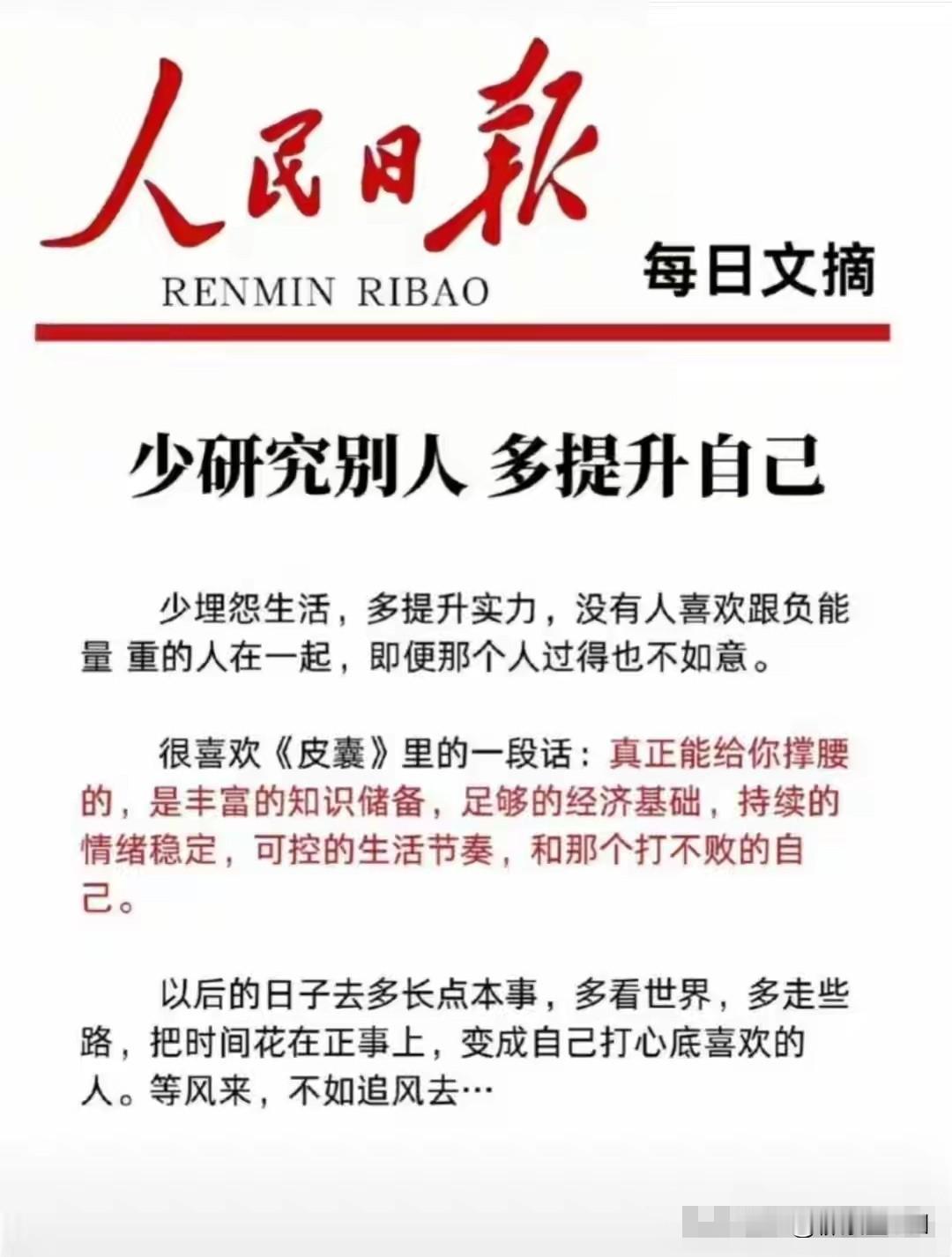 人生要主动出击,而不是坐等机会:1、你的认知决定了你的生活层次。 人这一辈子,真正拉开差距的,不是出身,不是运气,而是认知。高考之所以是一道分水岭,不只是一张卷子定去向,更是进了学堂,开了眼界,换了脑子,从此看人看事,都不再是一个层次。往后的日子更是如此,你能看多远、想多深、格局多大,就决定了你能站多高、走多稳。认知越高,人生的底线就越高;认知停了,人也就废了。永远别让自己困在旧想法里,脑子不停,路才不停。 2、人生要主动出击,而不是坐等机会。 别等到生活一巴掌扇在脸上,才想起要挣扎。日子安稳的时候,最危险;过得舒服的时候,最可怕。真正聪明的人,都是在顺境里找退路、谋出路、铺后路。主动去学、主动去闯、主动给自己多留几条路,让自己手里有选择,心里有底气。除非你已经富到不用愁,否则,坐等,就是等死;主动,才有生路。 3、所有进入你世界的人,你要有点门槛。 人生最忌讳来者不拒。谁都能靠近你,谁都能打扰你,谁都能闯进你的生活,最后只会把你搅得一团糟。谈恋爱、交朋友、找伴侣、处人情,都要有门槛,有筛选,有底线。不是你高冷,是你要对自己负责。把不值得的人挡在门外,你的日子才能清净,你的心才能安稳。 4、干活永远不要逞能。 别为了一点功劳、一句夸奖,就把自己往死里用。功劳是大家的,身体是自己的;钱是挣不完的,命是只有一条的。你拼命干活,累出一身病,痛的只有你自己,没人替你扛。把眼光放长远一点,那些眼前的得失、面子、争抢,其实都不算什么。这辈子,唯一真正属于你的,只有一副好身子。 5、不要多管闲事。 这世上最费力不讨好的,就是多管闲事。别人过得好与坏,走得对与错,都是他自己的命。你看不惯,扭头走;你想指教,闭嘴忍。别倚老卖老,别好为人师,别自作多情给人提建议。你以为是好心,别人觉得是冒犯;你掏心掏肺,别人当成驴肝肺。闲事管多了,麻烦就来了。 6、永远不要羡慕别人。 人一羡慕,心就乱;一比较,人就累。每个人的日子,都是自己的滋味,你看见的光鲜,未必是真的幸福;你羡慕的生活,未必适合你。人最傻的,就是盯着别人有的,忘了自己手里的。心态放平,日子过稳,守住自己的小幸福,比什么都强。 7、奢望公平只会让你陷入焦虑内耗。 这世上从来就没有绝对的公平。亲兄弟姐妹,父母还会偏心;走进社会,利益当前,谁还跟你讲公道?你越追公平,越觉得委屈;越想平等,越陷入内耗。别跟世道较劲,别跟人心较真。你要做的,是经历、是成长、是把自己的日子过好,讲好自己的人生故事。 8、人必须出门,必须拥有社交。 人不能把社交当成命,但也绝不能没有社交。关在家里,闷在屋里,只对着一方屏幕,脑子会僵,心会窄,路会短。走出去,见不同的人,听不同的事,看不同的活法,你的世界才会变大。人一动,思路才活;一活,生活就不会停滞。 9、不要太懂事的替他人着想。 太懂事的人,最委屈;总替别人想的人,最容易被忽略。你处处迁就,事事忍让,别人只会觉得你好欺负,不会觉得你善良。你没脾气,没底线,不拒绝,最后所有的破事都会堆到你头上。可以善良,但不能太软;可以体谅,但不能没自我。 10、别年纪轻轻就自以为跌落谷底。 很多年轻人,稍微受点挫折,就觉得人生完了、到底了、没救了。其实根本不是。你能跌的空间还大着呢,真正的谷底,你还没见过。别自己骗自己,别用一点委屈就把自己困住。年轻,就是用来摔、用来闯、用来爬起来的。只要你还在走,就永远不是谷底。对命运的认知 自我认知感悟 认知提升秘诀 认知低下的表现 个人认知格局 高层次认知技巧 个人认知思维