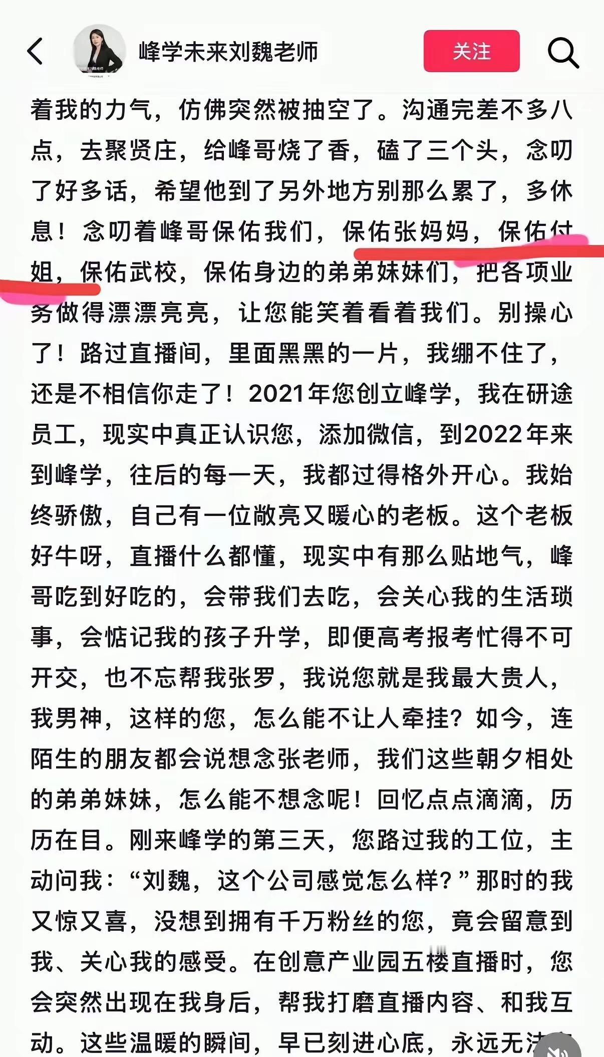 之前看张雪峰老师公司里的那些老师悼念他的文章,我们都会流泪,唯独看了地理老师,刘魏老师的这篇不想流泪,只觉得有点不对劲。刘老师负责苏州中考报志愿。 她在祭奠峰哥的文章中说峰哥在天之灵保佑张妈妈,保佑付姐,保佑武校,保佑身边的弟弟妹妹。却没有说保佑张老师的女儿,保佑他孩子的妈妈。看来付姐在公司的地位还是举足轻重的,在武亮校长的前面。