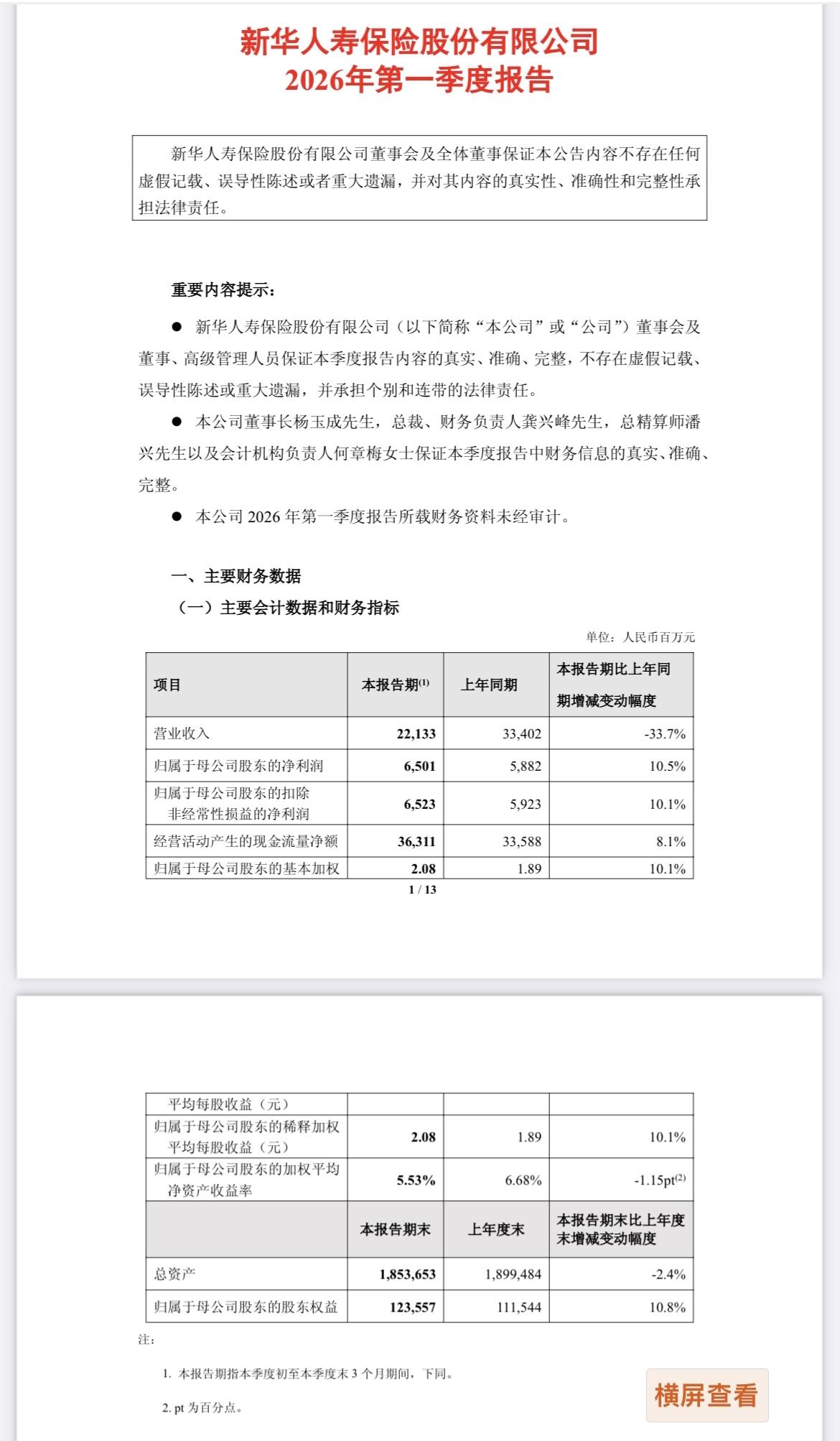 新华保险2026年一季报核心数据解读点评: …………………………………………… 核心数据亮眼: • 归母净利润:65.01亿元,同比+10.5%,在权益市场波动下实现稳健增长,盈利稳定性较强。 • 保费收入:原保费834.96亿元,同比+14.0%;长期险首年期交244.51亿元,同比+25.6%,十年期及以上期交保费同比大增113%,业务期限结构显著优化。 • 新业务价值(NBV):46.55亿元,同比+24.7%,增速大幅跑赢行业,分红险转型驱动价值释放,主业价值增长动能强劲。 • 业务品质:退保率0.4%,同比下降0.1个百分点;13个月、25个月保单继续率同比提升,业务质量持续改善。 • 投资端:投资资产1.80万亿元,一季度年化总投资收益率2.1%,综合投资收益率1.8%,受市场波动影响短期承压,长期配置价值仍在。 ……………………………………….. 点评: 新华保险一季度业绩超预期,负债端保费高增、NBV提速,分红险转型成效显著,业务结构与品质持续向好; 资产端受市场波动影响收益率短期承压,但整体稳健。 依托中央汇金背景与优质资产储备,公司长期增长确定性强,后续需关注权益市场波动对投资收益的影响及负债端转型的持续推进。 ………………………………………