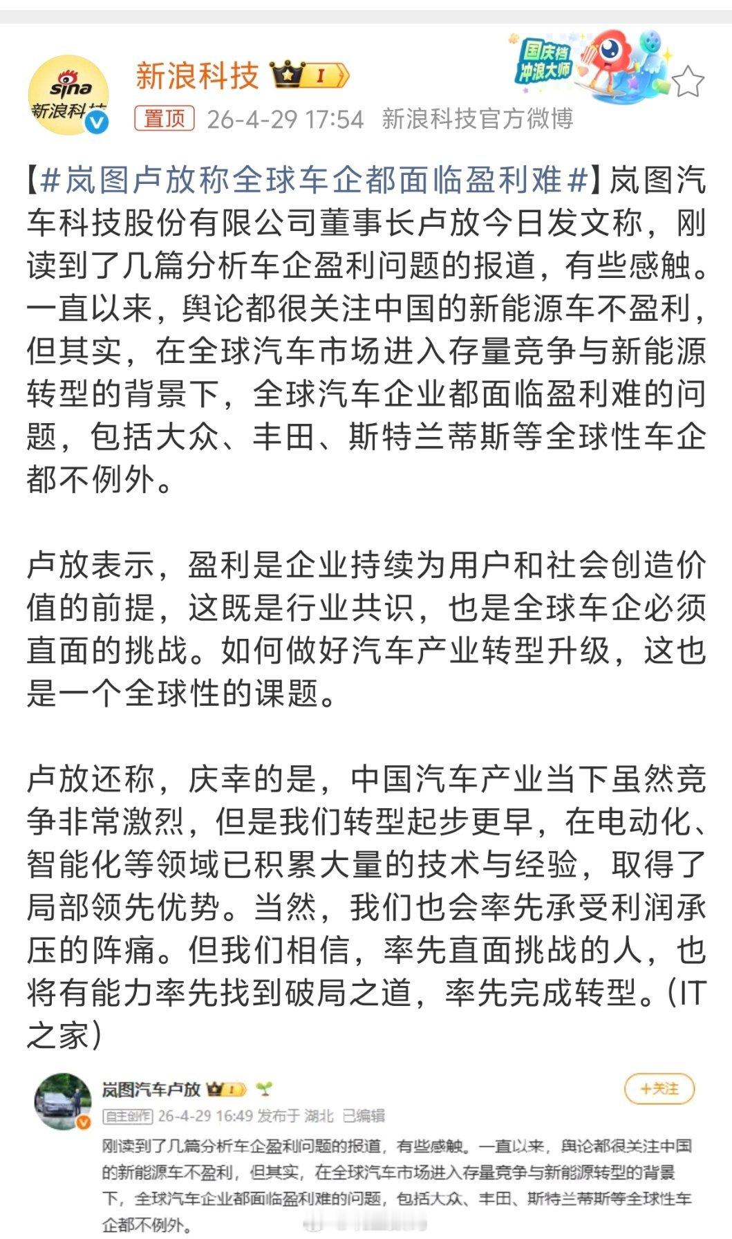 岚图卢放称全球车企都面临盈利难岚图卢放说,全球车企都面临盈利难。其实这话也就说对了一半,后面一句是,车企供应商反而赢麻了。造车的说自己赚钱难,甚至还有说不赚钱的。而不造车的却是大赚特赚,比如做电池的、比如做智驾的。那么,这究竟是谁的问题呢?