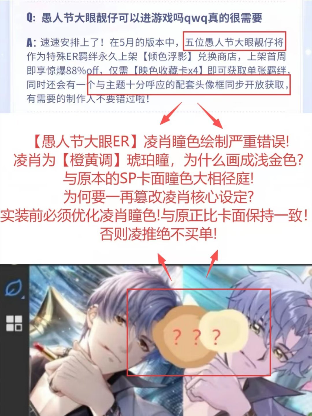 恋与制作人凌肖 关于愚人节卡面的瞳色问题,请大家积极敲客服叠纸在瞳色问题上已经三番五次犯错误了,一味的忍让只会换来变本加厉的对待。