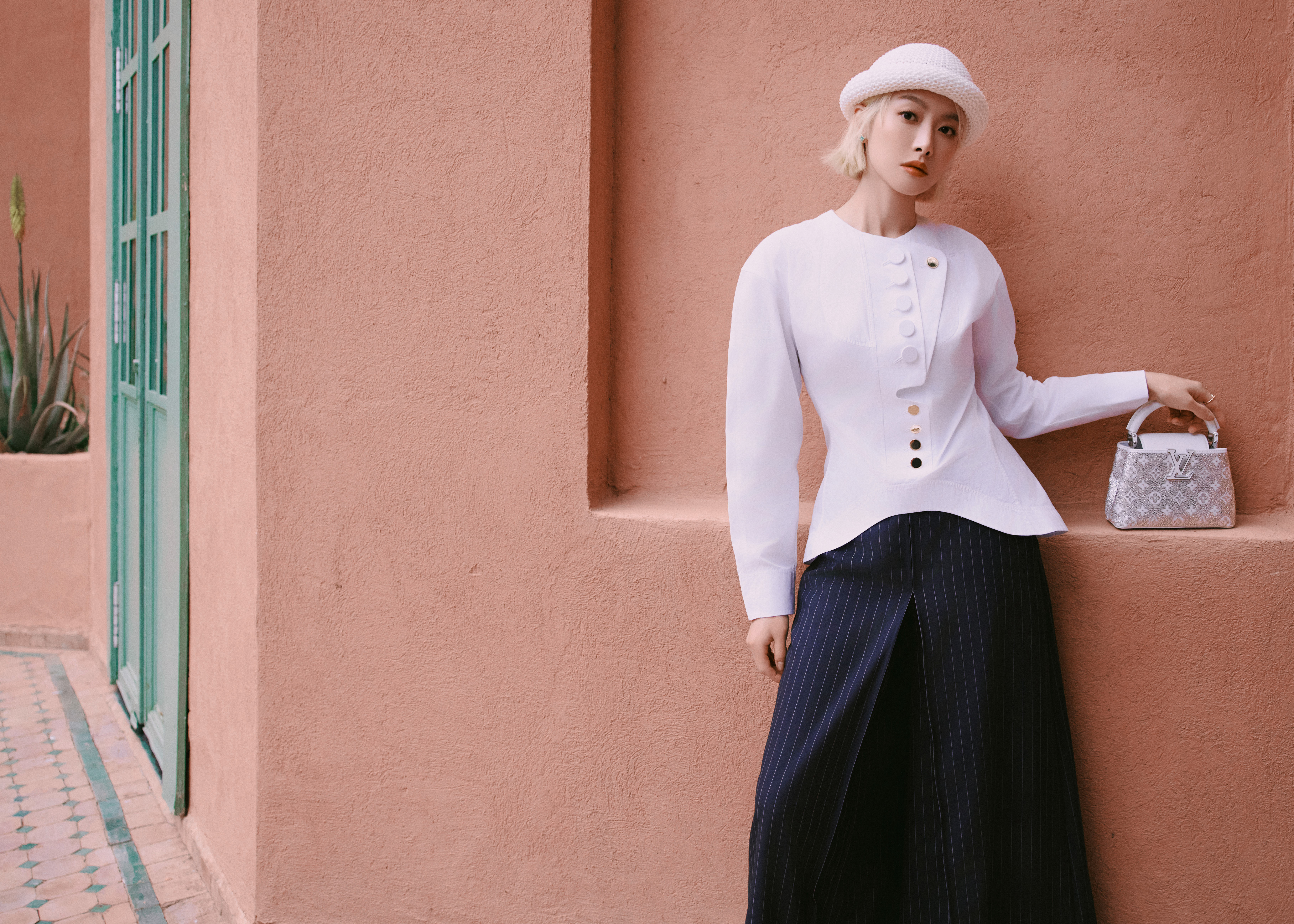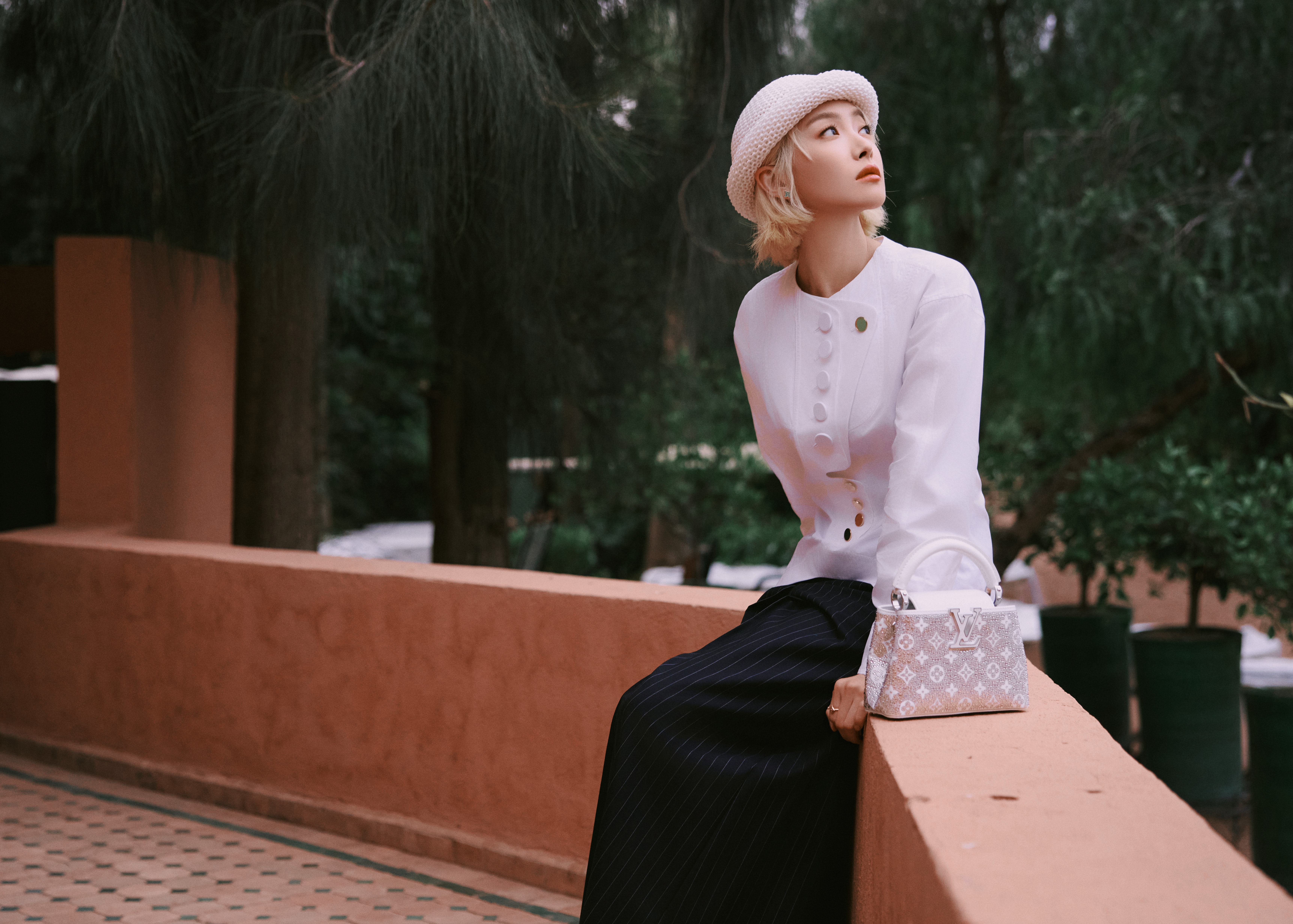 宋茜受邀出席Louis Vuitton摩洛哥高级珠宝展,身着立体剪裁收腰上装搭配廓形条纹裤装和针织圆帽,既有路易威登的摩登气质又有一些可爱氛围,带来耳目一新的Look演绎,好漂亮的Victoria ~