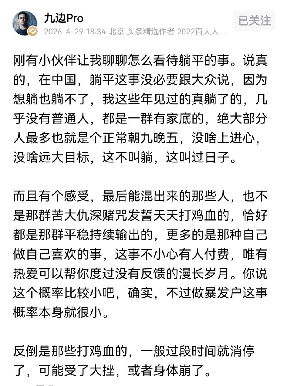 躺平不躺平没必要讨论,就按照自己节奏走不要停下来就行了。 躺平的人是啥也不干的人,这种人就算有一些家底也经不起空耗着,至少精神上是空虚的,哪怕不上班,也要找一些自己喜欢的事,让自己融入生活里。 生活会奖励不停下来的人,不管起点有多低,处境多么难,只要忍开始行动起来,一定有慢慢好起来的迹象。