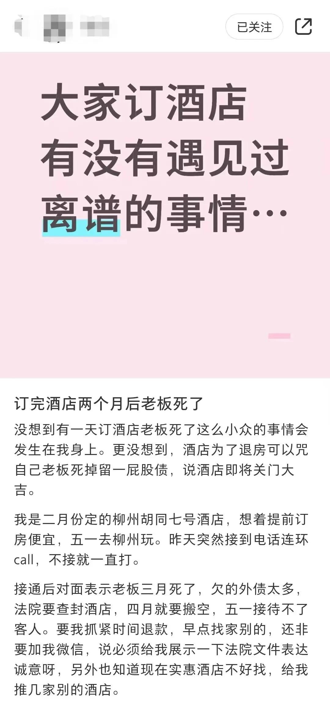 老板太狠了,竟然咒自己死。 女子计划五一去柳州玩,在二月份预订柳州胡同七号酒店万达广场店1号到5号的房间,总价494.85元。五一前接到酒店的电话,说老板去世,酒店要关门,赶紧退订。女子重新预订,多花900元,跟平台核实,该酒店正常运营,五一期间一晚就569元。 知道五一是黄金周,酒店就指着这几天挣点快钱,那也不能不讲诚信吧?如果不能提前那么久预订,是否可以不开放价格?已经预订了,宁可亏一点,也得让住客满意。那么大的酒店,差这么点钱? 女子已经向平台提供了相关记录,平台已进行调查,老板这回摊上事了。