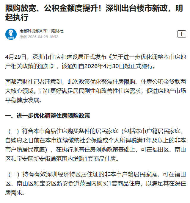 #深圳出台楼市新政明起执行#【限购放宽、公积金额度提升!深圳出台楼市新政,明起执行】#深圳公积金贷款额度最高上浮70%#4月29日,深圳市住房和建设局正式发布《关于进一步优化调整本市房地产相关政策的通知》,该通知自2026年4月30日起正式施行。此次政策优化聚焦住房限购、住房公积金贷款两大核心领域,旨在更好满足居民刚性和改善性住房需求。