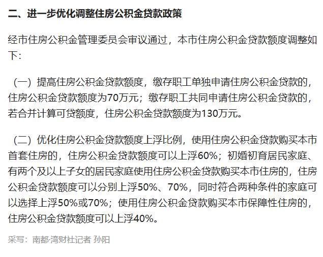 (二)优化住房公积金贷款额度上浮比例,使用住房公积金贷款购买本市首套住房的,住房公积金贷款额度可以上浮60%;初婚初育居民家庭、有两个及以上子女的居民家庭使用住房公积金贷款购买本市住房的,住房公积金贷款额度可以分别上浮50%、70%,同时符合两种条件的家庭可以选择上浮50%或70%;使用住房公积金贷款购买本市保障性住房的,住房公积金贷款额度可以上浮40%。采写:南都·湾财社记者 孙阳