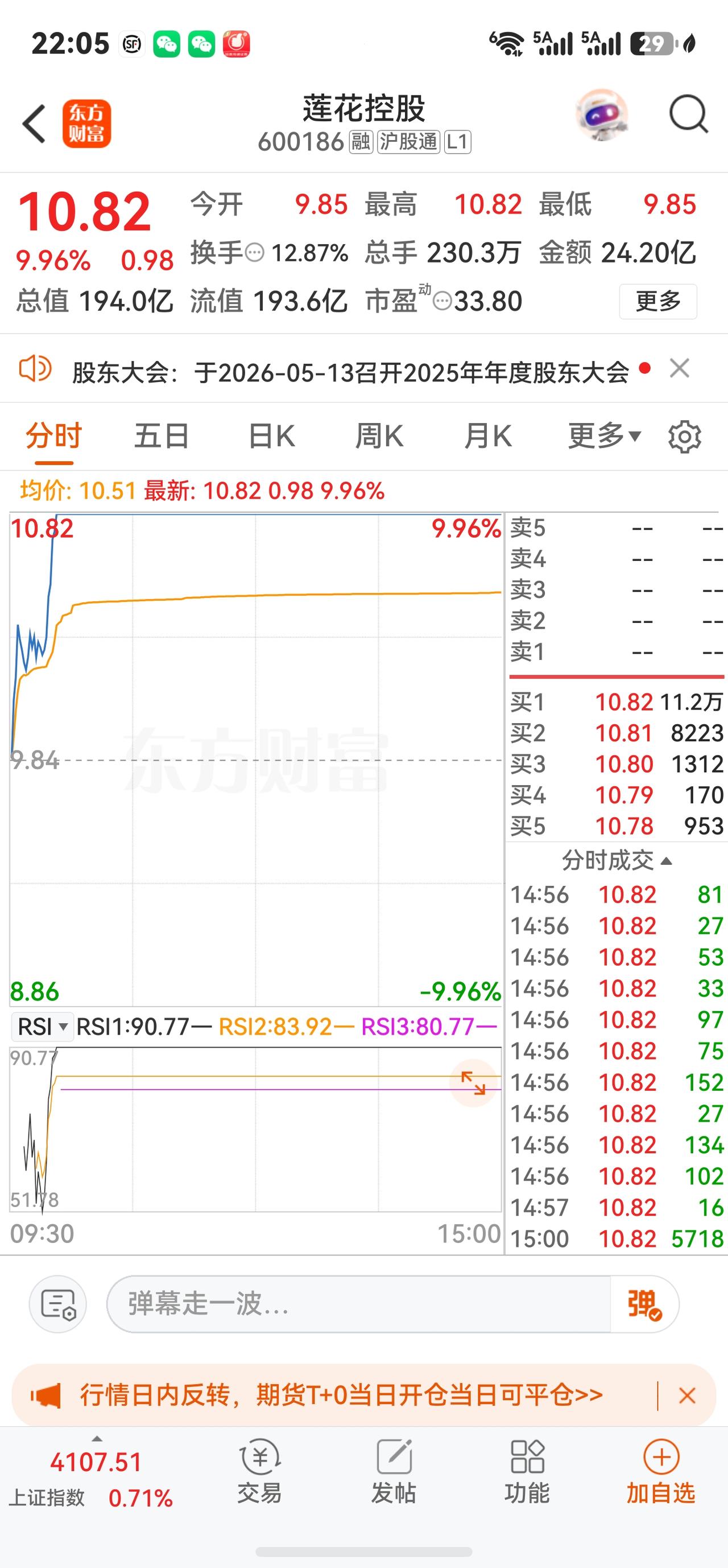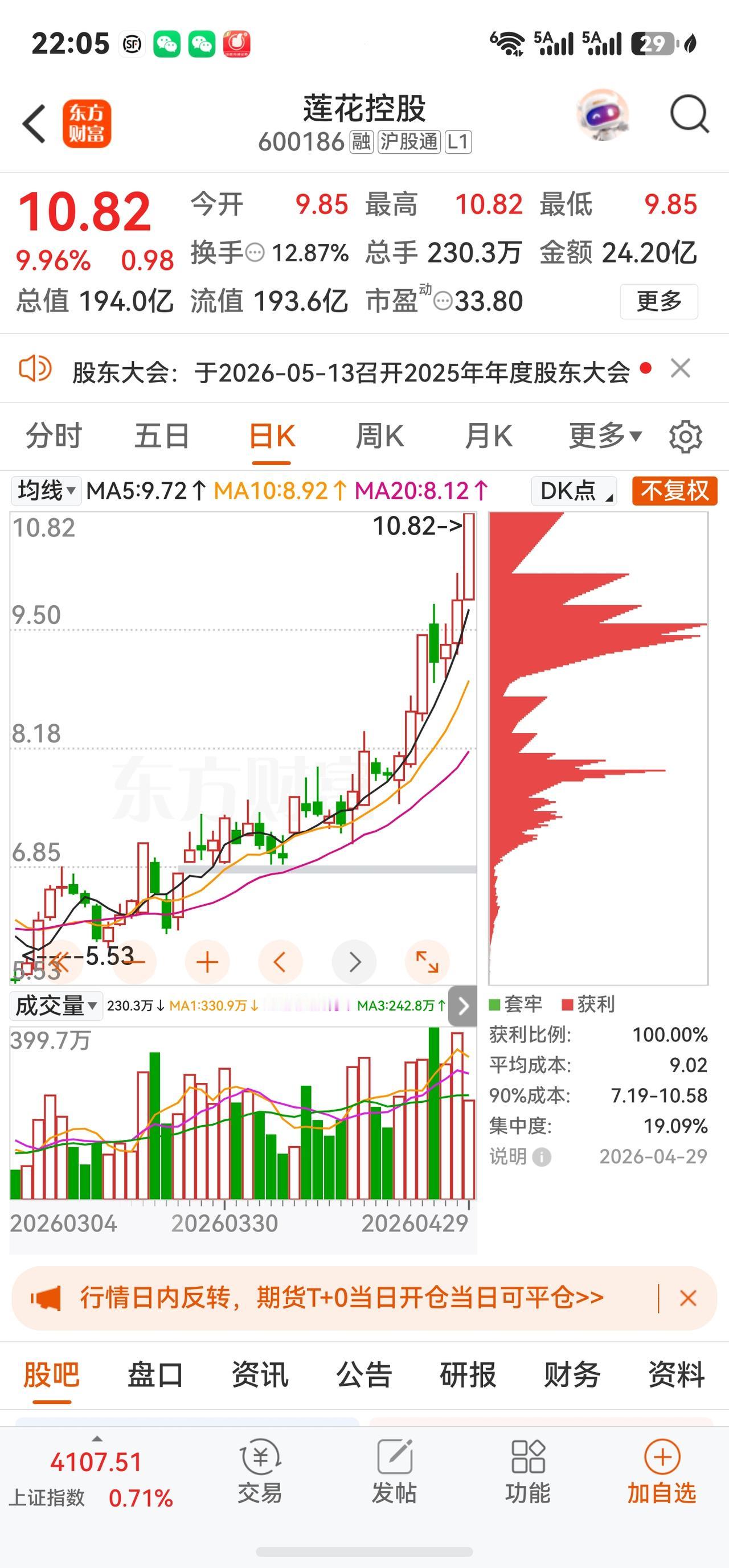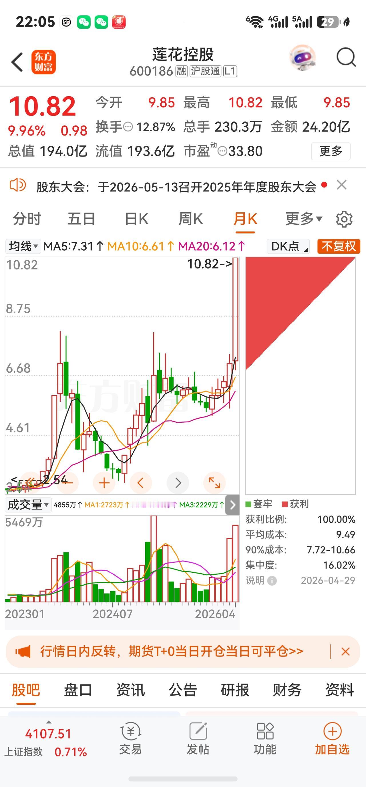 莲花控股A股今日走势情况及展望 一、当日行情要点 2026年4月29日莲花控股高开高走,以涨停价收盘,成交额暴增至24.20亿元。核心数据如下: 收盘价 10.82元 涨跌幅 +9.96% 今开 / 昨收 9.85 / 9.84元 最高 / 最低 10.82 / 9.85元 成交量 230.30万手 成交额 24.20亿元 换手率 12.87% 振幅 9.86% 量比 0.66 总市值 193.98亿元 静态市盈率 62.75倍 TTM市盈率 55.17倍 动态市盈率 33.80倍 市净率 10.27倍 二、当日盘面详解 早盘强势拉升至封板,盘中一度打开。 4月29日开盘价9.85元,较前一日大涨后继续高开。随后资金迅速涌入,9点51分即封涨停板;强势上涨引来获利盘涌出,9点59分涨停一度被打开,报10.79元,成交额已突破20亿元、换手率达10.75%,但买盘迅速回补,此后再度封板并维持至尾盘。 全天成交24.20亿元,创近期天量。 当日成交额约24.20亿元,换手率达12.87%,盘中多空换手极其充分,分歧较大。主力资金净流入高达4.95亿元,占总成交额的20.44%。而中单净流出约2.56亿元、小单净流出约2.38亿元,呈现"主力买入、散户获利出逃"的经典博弈格局。 资金面呈现"报喜不报忧"的特征。 本日主力净流入虽突破4.9亿元,但近5日整体资金净流出约5.70亿元,近30日大单净流出约3.08亿元,前期已有大量资金提前博弈季报行情后获利了结。截至2026年3月31日,北向资金持股3111.55万股(较上季末大增31.27%),申万宏源证券以3217.76万股位列第四大流通股东,前期资金储备相对扎实。 三、股价暴涨核心催化剂:一季报+第二增长曲线 (一)2026年一季报超预期 4月22日公司披露一季报,营收及利润增速均大幅超预期: 财务指标 2026年Q1 同比变化 营业收入 10.16亿元 +28.01% 归母净利润 1.43亿元 +42.06% 扣非归母净利润 1.39亿元 +39.18% 毛利率 31.43% +0.76pct 净利率 14.38% +0.89pct 2025全年业绩同样亮眼: 实现营收34.52亿元,同比增长30.45%;归母净利润3.09亿元,同比大增52.59%。年报与一季报形成共振,调味品主业的高景气与算力第二增长曲线的推进共同驱动股价。 (二)调味品主业加速增长,毛利持续改善 2026年Q1,味精等氨基酸调味品收入6.74亿元,同比增23.26%;鸡精等复合调味品收入1.28亿元,同比增18.19%;料酒等液态调味品收入0.54亿元,同比大增242.91%。毛利率同比提升0.76个百分点至31.43%,净利率14.38%,多项经营指标创近年最佳水平,规模效应与成本红利持续兑现。 线上渠道营收1.38亿元,同比暴增108.29%;线下营收8.71亿元,同比增19.71%,抖音、快手等兴趣电商平台拉动效应尤为显著。酱油产品多次登上抖音调味品类目成交金额榜首。 (三)"消费+AI科技"双轮驱动持续推进 算力服务业务虽因项目节奏波动出现阶段数据回落(Q1收入2700万元,同比-38.45%),但长期布局信号不变: · 孙公司莲花紫星已在自有算力上成功部署DeepSeek R1大模型,并支持智能体平台调用,后续有望与调味主业形成生态协同 · 通过摘牌取得纽菲斯新材料46%股权,进军电子绝缘积层胶膜(NBF系列)领域,已实现国产替代技术突破 · 嘉兴莲花东证华泽合伙企业间接投资国产半导体设备龙头企业XKL 2000万元,前瞻布局半导体设备国产化赛道 对标国际龙头味之素,公司通过精准投资布局人工智能、半导体设备及材料、芯片设计等前沿领域,为中长期估值重构提供持续催化。 四、机构观点与未来展望(截至4月29日) 东吴证券 买入 线上渠道增速强劲且势能延续;调味品+算力双主业稳步启航,业绩优于预期。 华鑫证券 买入 "消费+AI科技"双轮驱动;预计2026-2028年EPS为0.26/0.37/0.49元,对应PE 34/23/18倍。 国投证券 推荐(维持) 味精主业显著增长,第二增长曲线稳步推进;双轮驱动与规模效应同频共振。 机构盈利预测集中于2026年净利润4.4-4.6亿元区间,较2025年(约3.09亿元)同比增长约44%-49%,增速在高基数之上仍属可观。 ⚠️ 风险提示: 以上内容仅为行情数据及公开信息梳理,不构成任何投资建议。投资者需充分考虑短期追高风险,审慎决策、独立判断、自负盈亏。