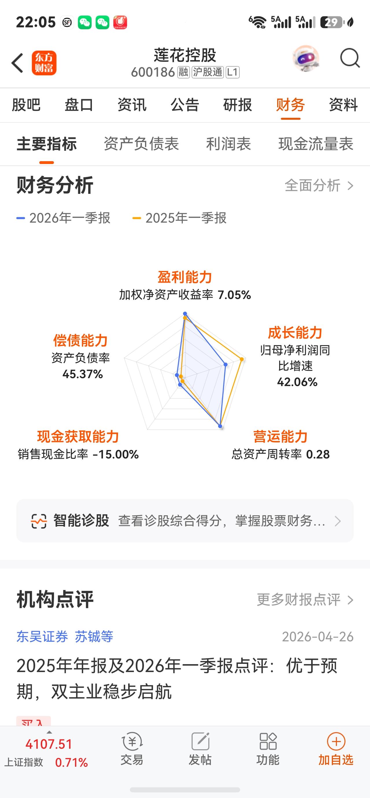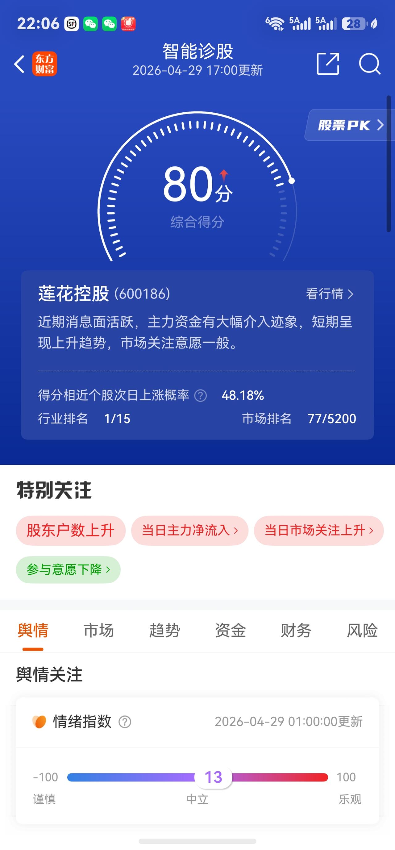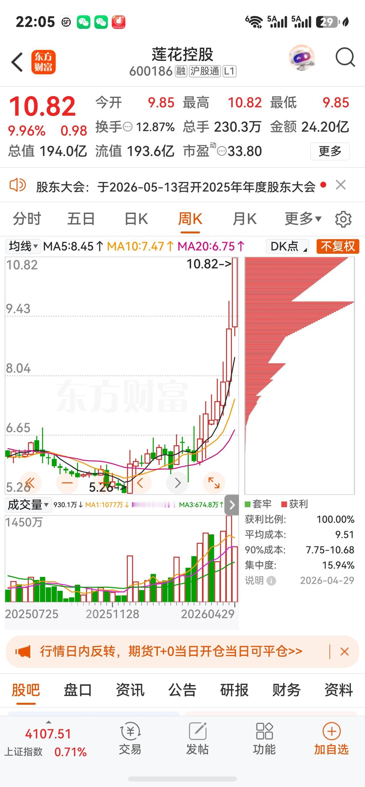 莲花控股A股今日走势情况及展望 一、当日行情要点 2026年4月29日莲花控股高开高走,以涨停价收盘,成交额暴增至24.20亿元。核心数据如下: 收盘价 10.82元 涨跌幅 +9.96% 今开 / 昨收 9.85 / 9.84元 最高 / 最低 10.82 / 9.85元 成交量 230.30万手 成交额 24.20亿元 换手率 12.87% 振幅 9.86% 量比 0.66 总市值 193.98亿元 静态市盈率 62.75倍 TTM市盈率 55.17倍 动态市盈率 33.80倍 市净率 10.27倍 二、当日盘面详解 早盘强势拉升至封板,盘中一度打开。 4月29日开盘价9.85元,较前一日大涨后继续高开。随后资金迅速涌入,9点51分即封涨停板;强势上涨引来获利盘涌出,9点59分涨停一度被打开,报10.79元,成交额已突破20亿元、换手率达10.75%,但买盘迅速回补,此后再度封板并维持至尾盘。 全天成交24.20亿元,创近期天量。 当日成交额约24.20亿元,换手率达12.87%,盘中多空换手极其充分,分歧较大。主力资金净流入高达4.95亿元,占总成交额的20.44%。而中单净流出约2.56亿元、小单净流出约2.38亿元,呈现"主力买入、散户获利出逃"的经典博弈格局。 资金面呈现"报喜不报忧"的特征。 本日主力净流入虽突破4.9亿元,但近5日整体资金净流出约5.70亿元,近30日大单净流出约3.08亿元,前期已有大量资金提前博弈季报行情后获利了结。截至2026年3月31日,北向资金持股3111.55万股(较上季末大增31.27%),申万宏源证券以3217.76万股位列第四大流通股东,前期资金储备相对扎实。 三、股价暴涨核心催化剂:一季报+第二增长曲线 (一)2026年一季报超预期 4月22日公司披露一季报,营收及利润增速均大幅超预期: 财务指标 2026年Q1 同比变化 营业收入 10.16亿元 +28.01% 归母净利润 1.43亿元 +42.06% 扣非归母净利润 1.39亿元 +39.18% 毛利率 31.43% +0.76pct 净利率 14.38% +0.89pct 2025全年业绩同样亮眼: 实现营收34.52亿元,同比增长30.45%;归母净利润3.09亿元,同比大增52.59%。年报与一季报形成共振,调味品主业的高景气与算力第二增长曲线的推进共同驱动股价。 (二)调味品主业加速增长,毛利持续改善 2026年Q1,味精等氨基酸调味品收入6.74亿元,同比增23.26%;鸡精等复合调味品收入1.28亿元,同比增18.19%;料酒等液态调味品收入0.54亿元,同比大增242.91%。毛利率同比提升0.76个百分点至31.43%,净利率14.38%,多项经营指标创近年最佳水平,规模效应与成本红利持续兑现。 线上渠道营收1.38亿元,同比暴增108.29%;线下营收8.71亿元,同比增19.71%,抖音、快手等兴趣电商平台拉动效应尤为显著。酱油产品多次登上抖音调味品类目成交金额榜首。 (三)"消费+AI科技"双轮驱动持续推进 算力服务业务虽因项目节奏波动出现阶段数据回落(Q1收入2700万元,同比-38.45%),但长期布局信号不变: · 孙公司莲花紫星已在自有算力上成功部署DeepSeek R1大模型,并支持智能体平台调用,后续有望与调味主业形成生态协同 · 通过摘牌取得纽菲斯新材料46%股权,进军电子绝缘积层胶膜(NBF系列)领域,已实现国产替代技术突破 · 嘉兴莲花东证华泽合伙企业间接投资国产半导体设备龙头企业XKL 2000万元,前瞻布局半导体设备国产化赛道 对标国际龙头味之素,公司通过精准投资布局人工智能、半导体设备及材料、芯片设计等前沿领域,为中长期估值重构提供持续催化。 四、机构观点与未来展望(截至4月29日) 东吴证券 买入 线上渠道增速强劲且势能延续;调味品+算力双主业稳步启航,业绩优于预期。 华鑫证券 买入 "消费+AI科技"双轮驱动;预计2026-2028年EPS为0.26/0.37/0.49元,对应PE 34/23/18倍。 国投证券 推荐(维持) 味精主业显著增长,第二增长曲线稳步推进;双轮驱动与规模效应同频共振。 机构盈利预测集中于2026年净利润4.4-4.6亿元区间,较2025年(约3.09亿元)同比增长约44%-49%,增速在高基数之上仍属可观。 ⚠️ 风险提示: 以上内容仅为行情数据及公开信息梳理,不构成任何投资建议。投资者需充分考虑短期追高风险,审慎决策、独立判断、自负盈亏。
