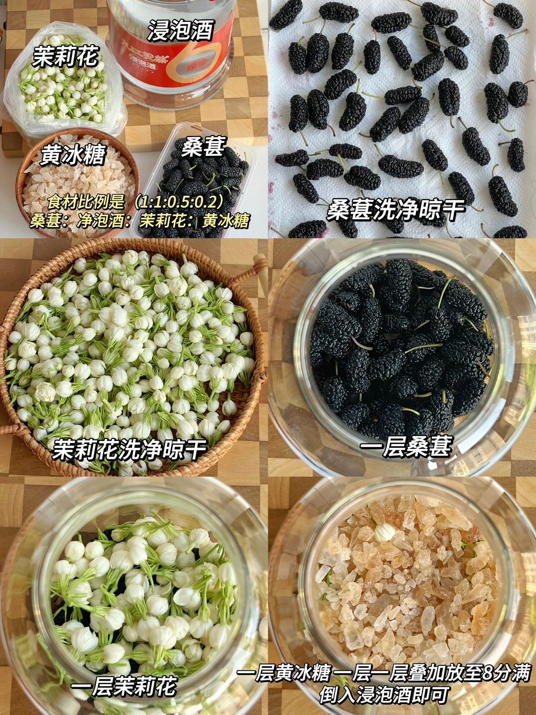 ✅食材准备:桑葚、茉莉、果酒,比例是1:1:0.5:0.2
