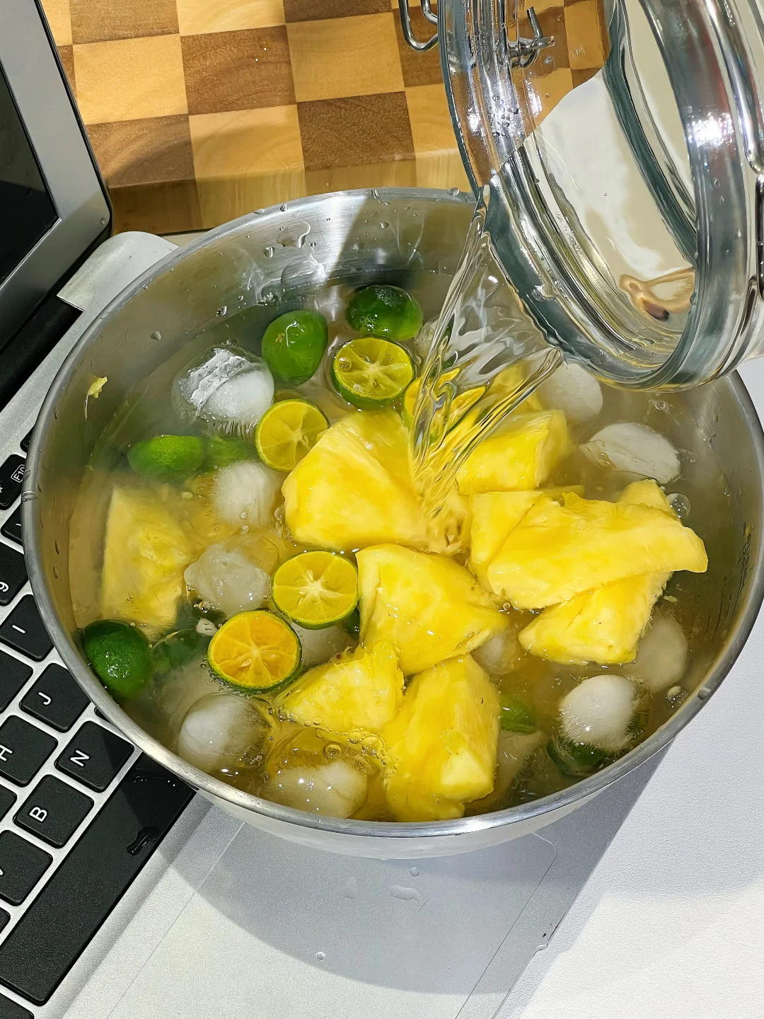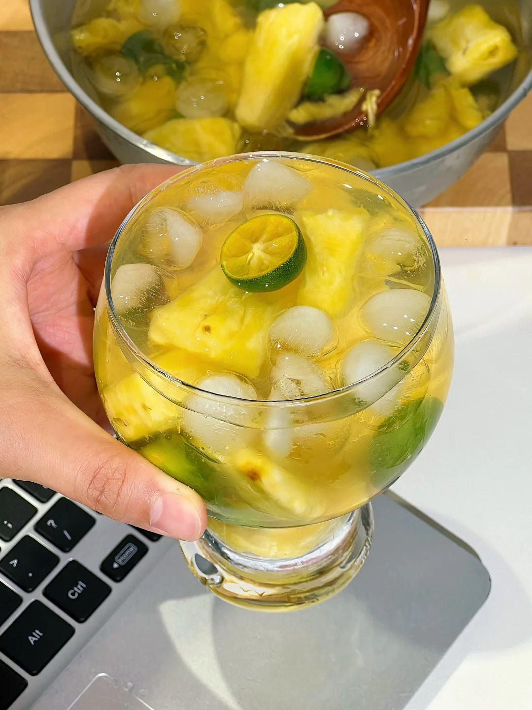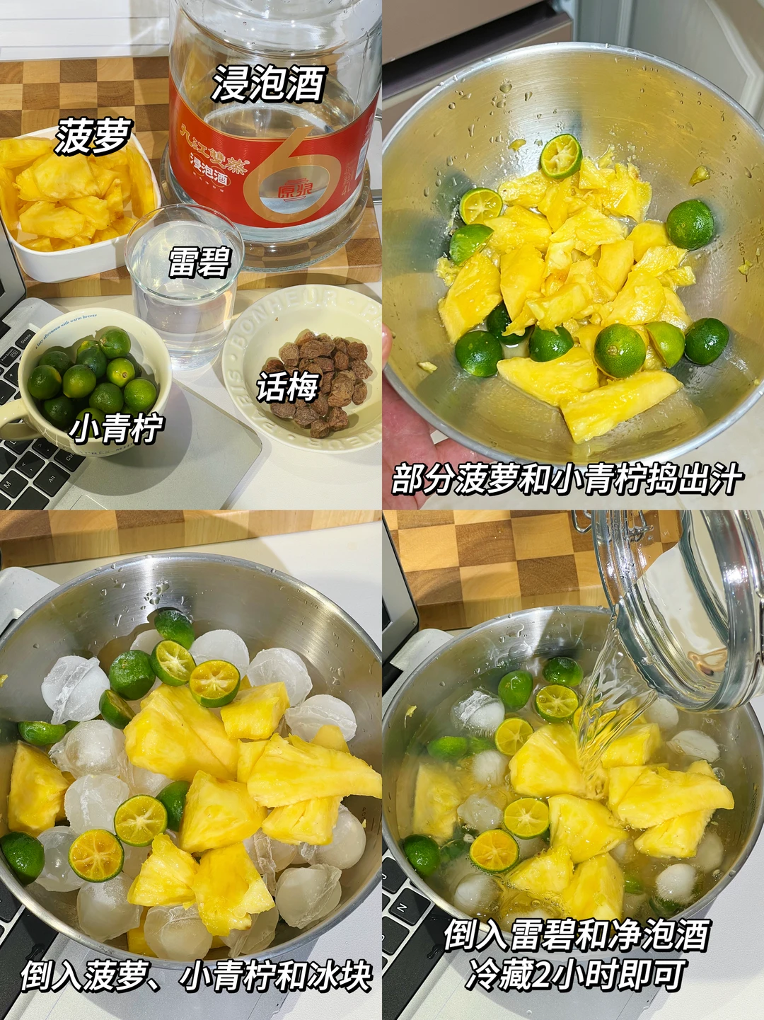 ✅食材准备:菠萝、汽水、小青柠、话梅、浸泡酒,比例为1:1:0.5:0.2:1