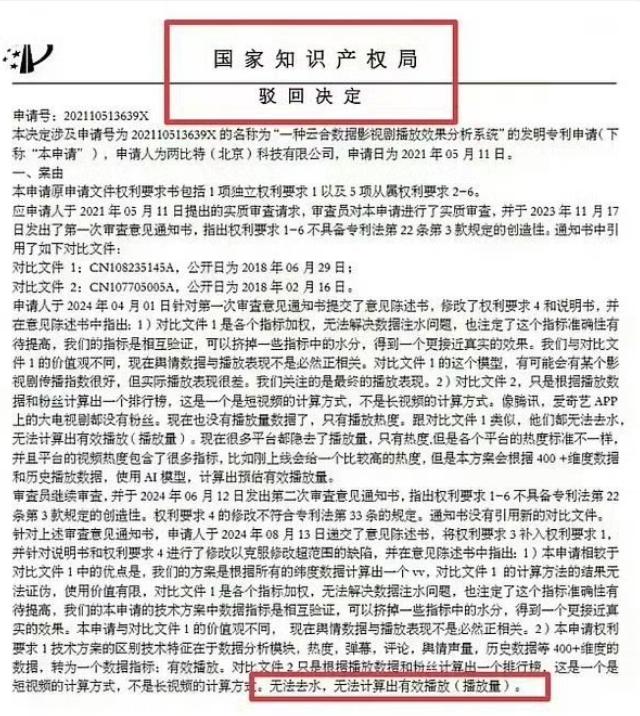云合被废了! 云合申请专利被国家知识产权局驳回,官方认定其算法无法计算有效播放量且无法“脱水”,也就是无法剔除异常流量,云合原本就是抓取其他平台的数据生成的预估播放量,无法剔除片方或者其他方买水情况,所以不具备专利性,但是就目前来看,内娱依旧没有能取代云合大数据结算平台,目前各数据平台给出的数据都做不到透明化计算,广电完全可以推一款权威的数据平台出来。