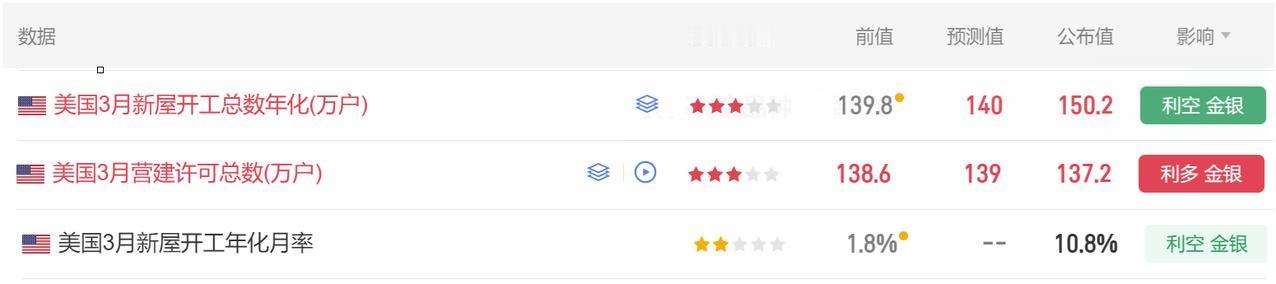 今晚多项美国经济数据公布。 首先美国3月新屋开工总数年化 150.2万户, 为2024年12月以来新高; 市场预期140万户,前值148.7万户。 其次美国3月营建许可总数 137.2万户, 市场预期139万户,前值138.6万户。 最后美国3月营建许可月率 -10.8%,前值-4.70%。 这三项数据有两项是利空金价的, 数据公布以后, 国际金价回落十几美元。