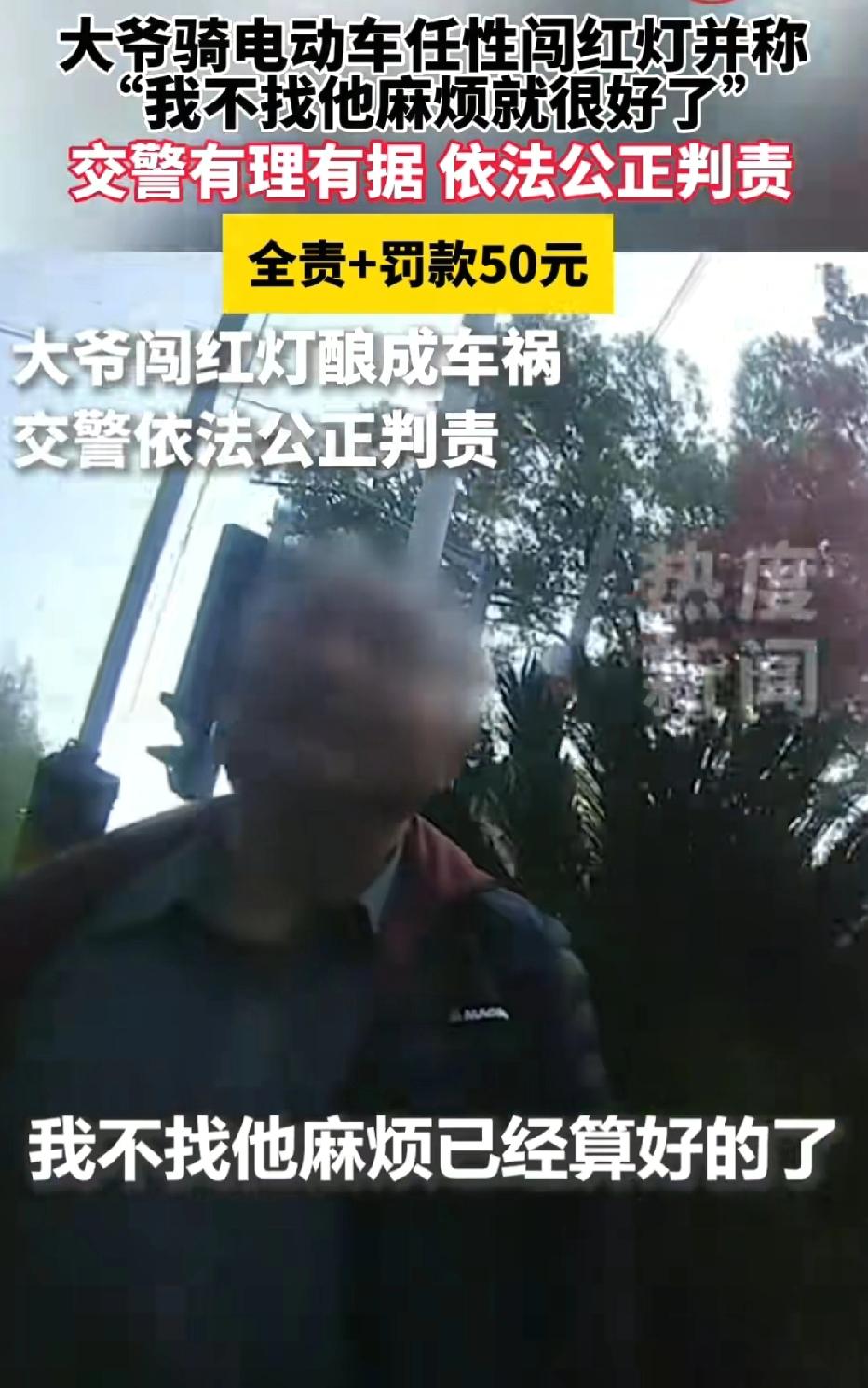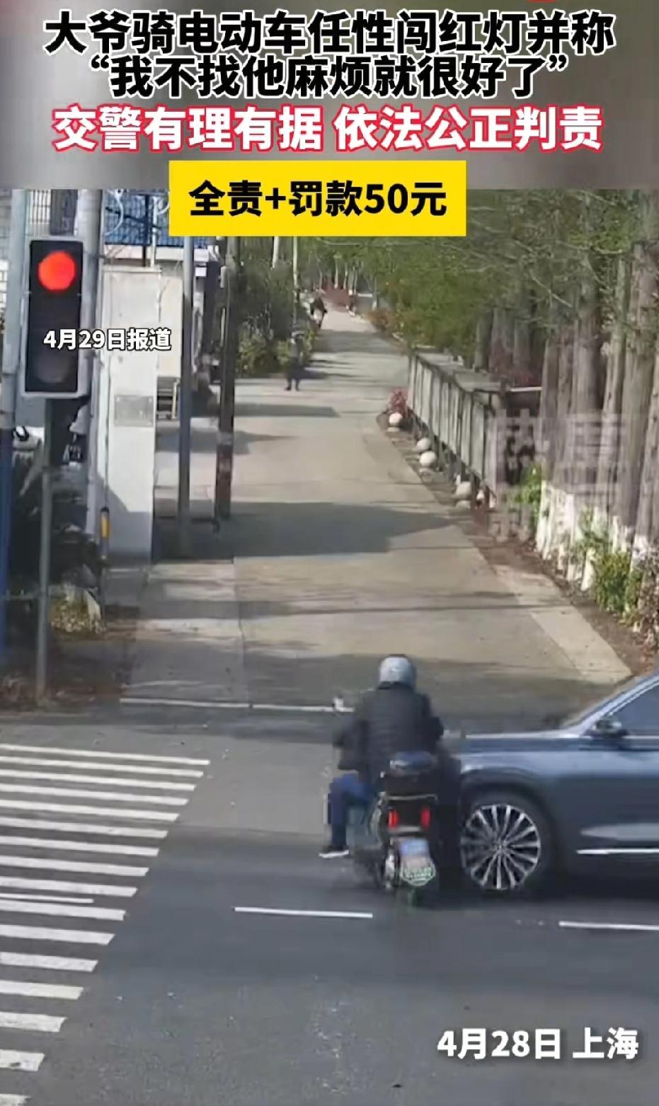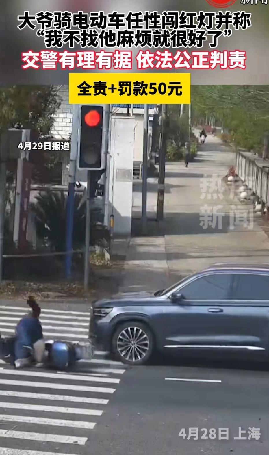 上海,大爷骑车路过路口,信号灯变红,他直接闯红灯横穿,不料,大爷当场被撞倒在地。交警到场调监控定责,大爷却表示:没找司机算账就不错了,司机当场看傻眼。交警认定大爷违规全责,罚款五十元。 事发当天,大爷骑着非机动车由西向东驶来,临近路口时,信号灯由绿转黄。 按照交通规则,黄灯亮起意味着警示,提醒车辆减速准备停车,而不是加速抢行 。 可这位大爷一见黄灯,非但没有减速,反而下意识加快速度,想趁着黄灯“冲过去”。 他自以为只要在红灯亮起前越过停止线,就不算违法。 可就在他距离停止线还有一两米时,黄灯瞬间结束,红灯亮起。 按照法律规定,红灯亮时,禁止车辆通行 。此时大爷尚未越过停止线,理应立刻停车等候。 但他心存侥幸,索性直接闯红灯,继续往前横穿路口。 就在这时,一辆机动车由南向北正常直行,司机严格按照绿灯信号通行,车速正常、行驶合规。 双方在路口中央猝不及防相遇,大爷的非机动车与汽车正面相撞,冲击力将大爷连人带车撞倒在地,车子歪在一边,大爷只是受点轻微伤。 事故发生后,机动车司机赶紧下车查看,大爷坐在地上,一边揉着身体,一边情绪激动,丝毫没有意识到自己闯红灯的过错,反而一脸理直气壮。 交警很快赶到现场,第一时间安抚双方,随后开始调查取证。 大爷甚至放出一句让司机和在场人都震惊的话:“我还没找司机的麻烦就已经很不错了!” 这话一出,司机当场傻眼,一脸难以置信:自己正常行驶,无辜被撞,反倒像“理亏”的一方。 交警先询问大爷:“当时你过来的时候,信号灯是什么灯?你看到红灯了吗?” 大爷毫不犹豫回答:“是黄灯!我看见是黄灯才过来的,我没闯红灯!”语气坚定,仿佛自己完全没错。 交警没有争辩,直接调取路口监控录像。 监控画面清晰显示:大爷骑车接近路口时,确实先遇到黄灯,但黄灯亮起时,他距离停止线还有数米,并未越线 。 紧接着信号灯转为红灯,大爷不仅没有停车,反而继续向前,在红灯状态下越过停止线、驶入路口,属于典型的闯红灯行为。 监控铁证面前,真相一目了然:机动车正常绿灯直行,无任何违规。 大爷黄灯未减速、未越线,红灯后继续通行,违法闯红灯,是导致事故发生的唯一原因 。 看到监控后,大爷的态度明显软了下来。 交警当场对大爷进行普法教育,明确告诉他:黄灯不是冲刺信号,而是减速警示;黄灯亮时,只有已经越过停止线的车辆才能继续通行,未越线必须停车 。 你在黄灯未越线、红灯亮起后继续通行,已经违反交通信号灯规定,属于闯红灯,且直接引发事故,应当承担全部责任。 大爷听完,自知理亏,不再强辩。他以为最多只是被口头教育几句,事情就过去了,于是挣扎着想要爬起来,准备骑上车离开现场。 交警立刻上前制止,严肃告知:“你现在不能走,你已经闯红灯违法,并且造成交通事故,依法需要接受处罚。” 大爷傻眼,只好配合交警工作。 《道路交通安全法》第89条规定,行人、乘车人、非机动车驾驶人违反道路交通安全法律、法规关于道路通行规定的,处警告或者五元以上五十元以下罚款;非机动车驾驶人拒绝接受罚款处罚的,可以扣留其非机动车。 随后,交警依据法律规定,对大爷作出处理:认定大爷闯红灯违反交通规则,承担事故全部责任,处以罚款50元。 《道路交通安全法》第76条规定,机动车与非机动车发生事故,有证据证明非机动车驾驶人有过错的,根据过错程度适当减轻机动车一方的赔偿责任;机动车一方无过错的,不承担赔偿责任 。 机动车完全正常行驶,大爷闯红灯是唯一过错,故大爷全责。 法不能向不法让步,大家要严格遵守交通规则。