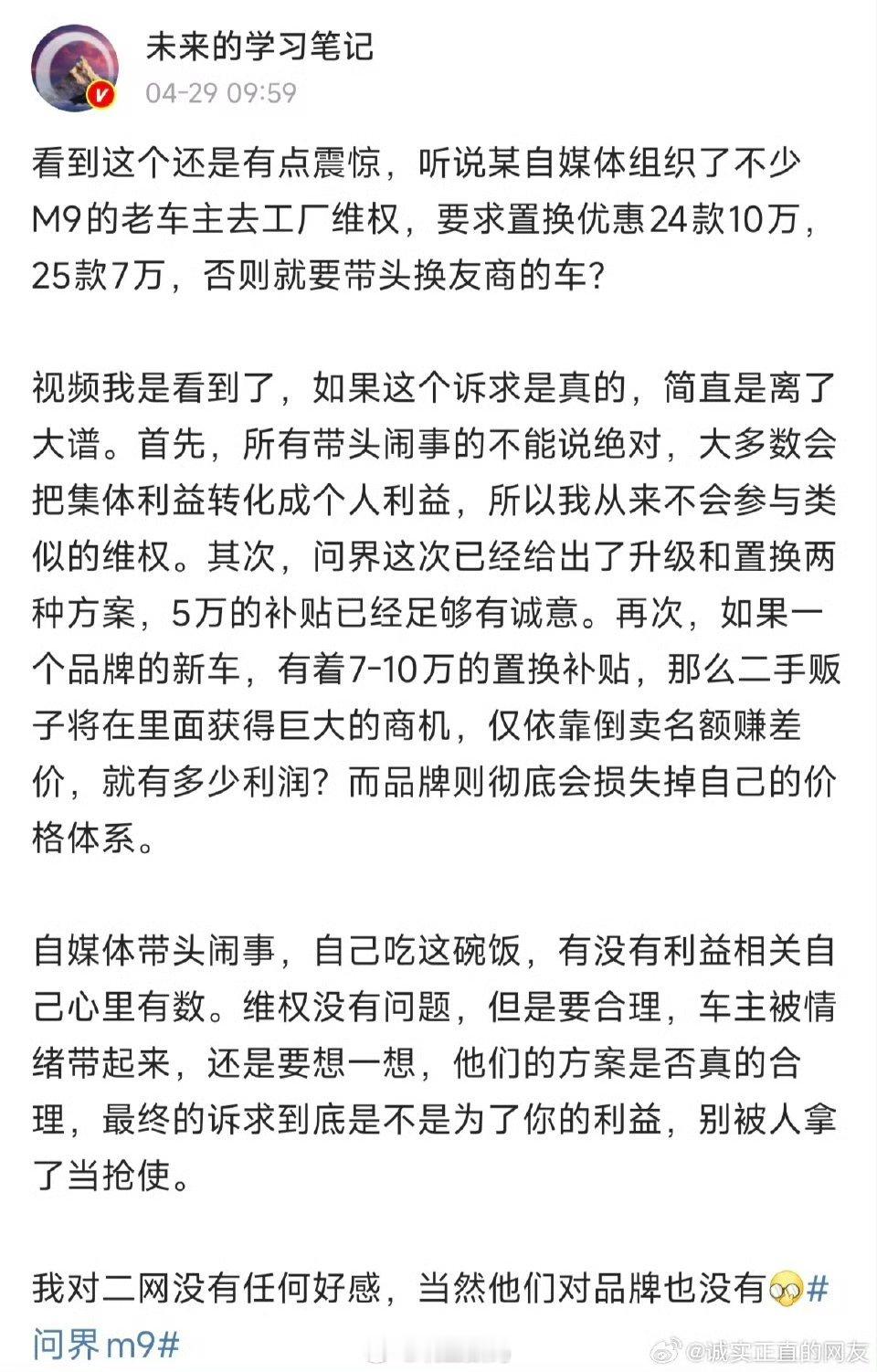 如果真有自媒体组织闹事,并且还有实质性的利益关联,那可是妥妥的违法行为。更别说要直接找问界要高达7万、10万的优惠了,这弄不好就会上升到勒索敲诈。这个指控是很严重的,如果没有实质性证据,光是凭一句“心里有数”可是很危险的。