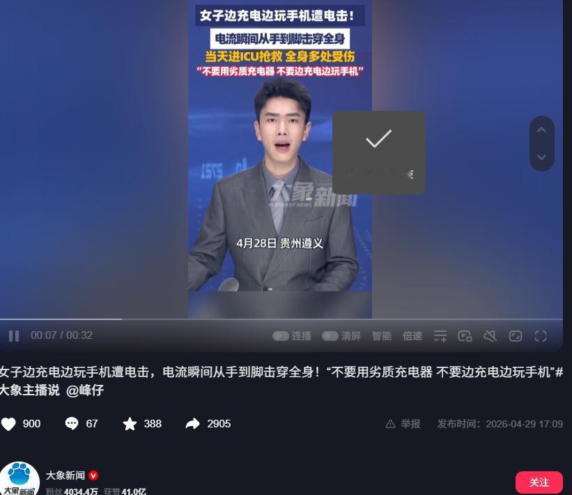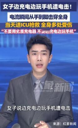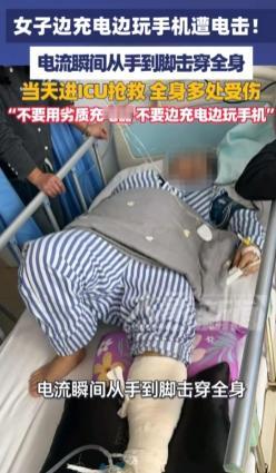 4月29日报道,贵州女子图便宜用劣质充电器,边充电边玩手机遭电击,从手到脚被电流击穿,进 ICU 抢救才保命,亲身经历告诫所有人:别再心存侥幸! 边给手机充电边使用,是很多人习以为常的习惯,却很少有人意识到,这个看似平常的举动,可能藏着致命风险。 贵州遵义的孙女士,就因为这样一个不经意的行为,经历了一场生死考验,险些丧命。 孙女士遭遇电击的根源,在于她使用的并非手机原装充电器,而是一款图便宜买来的劣质产品。 这类未经正规安全检测的三无充电器,内部电路简陋、绝缘性差,充电时极易发生短路、漏电,一旦人体接触,强大的电流就会瞬间击穿身体,后果不堪设想。 孙女士的遭遇,更是给所有人敲响了警钟。 3月5号那天,和往常一样,她坐在家里的沙发上,一边给手机充电,一边低头刷手机,没有任何预兆,一股强烈的电流突然从握着手机的手窜出,瞬间贯穿全身,从手部一路击穿到脚底,她当场被电击倒地,失去了意识。 万幸的是,孙女士的表弟当时恰好在身边,发现异常后没有丝毫犹豫,立刻将她紧急送往医院抢救。 由于电击伤势过重,孙女士当天就被送进了ICU重症监护室,经过医护人员一夜的全力救治,直到第二天才勉强脱离生命危险,转入普通病房。 之后的半个月里,孙女士在医院接受了系统的治疗和休养,一点点从鬼门关爬了回来,直到4月28号,才终于康复出院。 事后孙女士回忆,她当时使用的充电器,并不是手机原装的,而是之前图便宜,在路边小店随手买的劣质产品。 现在想来,正是这个看似不起眼的劣质充电器,成了这场生死危机的导火索。 康复出院后,她特意将自己的经历公之于众,不为别的,就是想以亲身经历现身说法,唤醒更多人的安全意识。 很多人充电时舍不得放下手机,总抱着“偶尔一次没关系”的侥幸心理,却忽略了安全从来没有“侥幸”可言。 孙女士的幸运,在于表弟及时发现、医护人员全力救治,可并不是每个人都能有这样的好运,一次疏忽,就可能付出生命的代价。 孙女士的经历曝光后,网友们纷纷留言感慨。 有网友表示“看完一身冷汗,自己每天都边充电边玩手机,以后再也不敢了”,也有网友分享“曾用过劣质充电器,充电时手机发烫,现在想来太可怕”。 还有网友提醒“原装充电器虽然贵,但能保命,别为了省几十块钱拿生命冒险”,不少网友呼吁大家转发提醒身边人,杜绝边充电边玩手机的危险习惯。 日常使用手机时,有两个关键一定要记住:一是坚决不用三无、劣质的充电器和数据线,哪怕原装的贵一点,也别为了省钱拿自己的生命冒险。 一场电击,让孙女士在医院躺了半个月,也让她真切体会到了生命的脆弱。 她把自己的遭遇分享出来,就是希望没有人再重蹈她的覆辙。 希望每一个看到这篇内容的人,都能引以为戒,规范使用充电设备,杜绝边充电边玩手机的危险习惯,守住自己和家人的安全底线。 如果各位看官老爷们已经选择阅读了此文,麻烦您点一下关注,既方便您进行讨论和分享,又能带来不一样的参与感,感谢各位看官老爷们的支持! 信息来源:大象新闻《女子边充电边玩手机遭电击,电流瞬间从手到脚击穿全身!“不要用劣质充电器 不要边充电边玩手机”大象主播说》