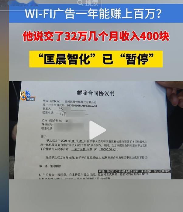 广东广州的梁先生看中一个WI-FI广告项目,号称“门槛低、一年赚上百万”,交钱合作后却发现全是坑。等他好不容易跟公司协商好退费方案,钱还没退完,谁知公司直接玩起失踪,登记地址人去楼空,电话再也打不通。 梁先生,最近这段时间愁得吃不下饭、睡不着觉,手里攥着半截没履行完的退费协议,却连对方公司的人影都找不到。当初满心欢喜以为能靠一个WiFi广告项目发家致富,到最后不仅没赚到一分钱,还被卷走了一笔合作款,维权无门的滋味,只有他自己最清楚。 事情的转折,发生在他和对方公司协商好退费方案之后。那段时间,他天天找公司沟通,软磨硬泡了快一个月,对方才松口,答应分三次退还他缴纳的合作费用,还签订了书面的退费协议,约定好每次退费的时间和金额。 第一次退费到账的时候,梁先生还松了口气,觉得事情终于有了转机,至少能挽回一部分损失。他按照协议约定,耐心等待后续两笔退费到账,可左等右等,约定的时间过了一天又一天,第二笔退费始终没有动静。 他试着拨打公司的客服电话,一开始还能打通,只是对方总以“财务对账”“领导审批”为由推脱,让他再等等。可到了后来,电话要么无人接听,要么直接提示无法接通,微信消息也石沉大海,再也没有工作人员回复他。 察觉不对劲的梁先生,特意驱车赶到公司的登记地址,眼前的一幕让他彻底慌了神。原本应该正常办公的场地,已经人去楼空,大门紧锁,玻璃门上贴着一张模糊的转租通知,里面的办公设备早已搬空,只剩下满地的垃圾和废弃的纸张。 谁能想到,就在几个月前,梁先生还因为这个WiFi广告项目,满心期待着一年赚上百万的日子。当时他在网上刷到这个项目的广告,主打“门槛低、零经验可做、一年轻松赚百万”,还附带着各种看似真实的盈利截图,看得他心痒不已。 广告里还宣称,不需要投入太多精力,只要合作后铺设相关设备,后续就能靠WiFi广告点击量赚钱,公司会全程提供技术支持和运营指导,就算是新手也能快速上手,不用承担任何风险。这样的宣传,让想额外赚点钱的梁先生动了心。 他主动联系了项目方,对方的工作人员热情十足,不断给她讲解项目的优势,还发来不少所谓的“合作成功案例”,说很多人靠这个项目实现了财务自由。被说动的梁先生,没有过多犹豫,很快就和对方签订了合作协议,缴纳了一笔合作费用。 可等到真正开始合作,梁先生才发现,这一切都是精心设计的套路。所谓的“全程技术支持”,不过是发了几份简单的操作手册;承诺的“高收益”,连一分钱都没见到,甚至连最基础的设备铺设,都需要他自己花钱找人完成。 他这才意识到自己踩坑了,连忙找公司要求退费,可对方一开始态度强硬,拒不退款,还拿出合同里的霸王条款推脱责任。直到他反复找公司协商,甚至提出愿意承担一部分损失,对方才勉强同意退费,可没想到,退费只进行了一半,公司就直接玩起了失踪。 如今,梁先生手里的退费协议变成了一张废纸,缴纳的合作款打了水漂,找遍了所有能联系的渠道,都找不到项目方的踪迹。他只能拿着协议和缴费凭证,四处奔波维权,可每次都毫无进展,满心的委屈和无奈,却无处诉说。 对此,你们有什么看法,欢迎评论留言~