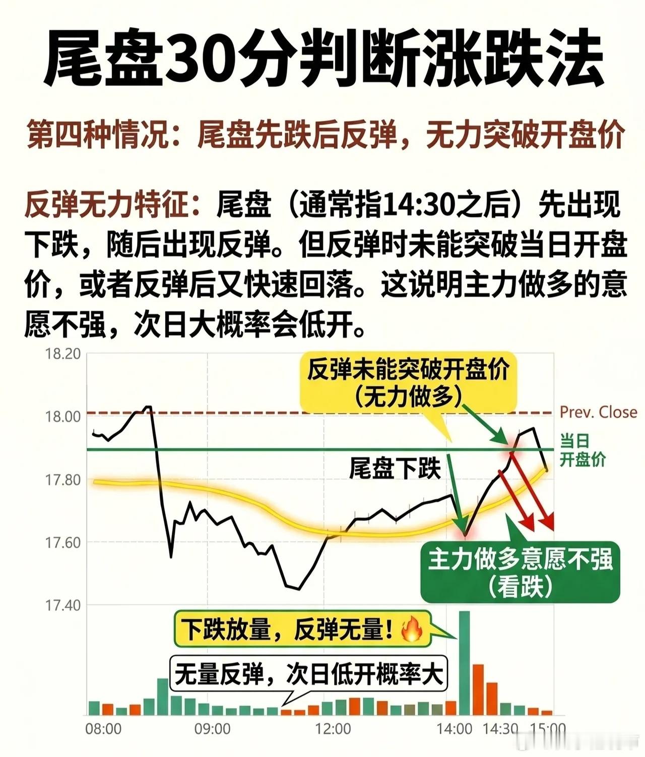 形态特征:尾盘(通常指14:30之后)先是出现一波下跌,随后展开反弹,但反弹力度很弱,未能突破当日开盘价,或者反弹后很快又快速回落。