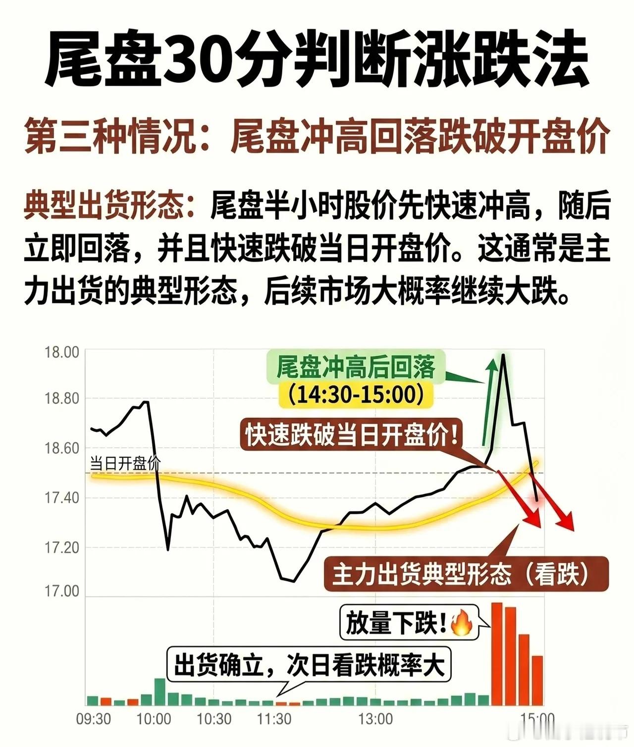 第三种情况:尾盘冲高回落跌破开盘价