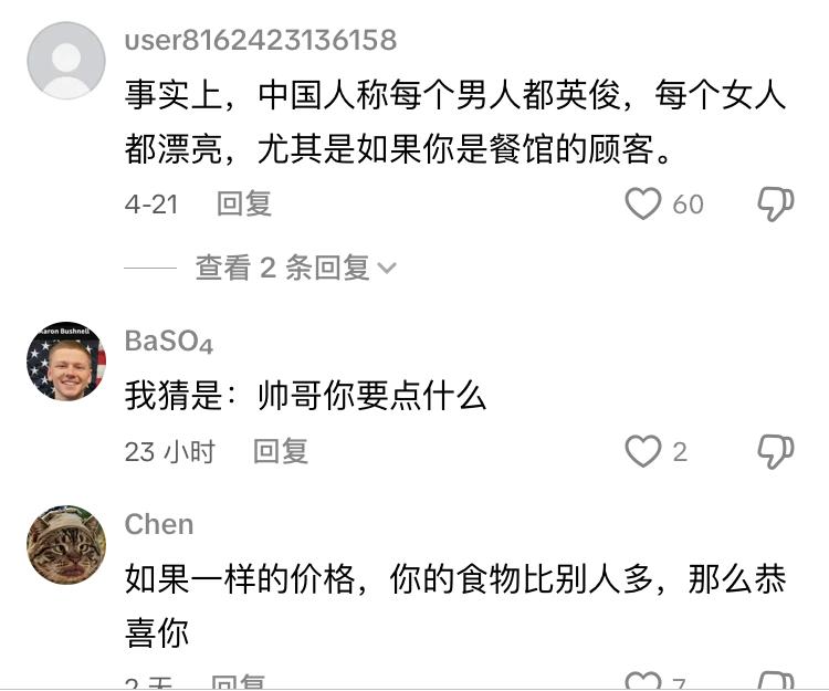 中国大妈叫老外帅哥,让他自信心爆棚 那个老外去中餐厅订餐的时候,大妈喊他“帅哥”这让他非常的开心,他觉得大妈的眼光非常好,并且还骂那些总是说他丑的人滚 说不定这个大妈可能是广东人,因为在广东,不管男女老少都是靓仔靓女
