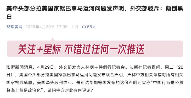 美国突然牵头多国针对巴拿马运河指责中国,明明我们才是受害者,现在倒成我们不是了。 巴拿马运河为何成了大国博弈焦点?美国频频抹黑中国,真实目的又是什么? 4月28日,美国拉着玻利维亚、哥斯达黎加等几个拉美国家,公开发表了一份关于巴拿马运河的联合声明。 这份声明一出来就充满火药味,直接把矛头对准中国,说中国的相关做法威胁到其他国家,还扣上 “把海上贸易政治化” 的帽子,甚至编造中国施压巴拿马籍船只的谎言。 明眼人都能看出来,这份声明不是突然出现,更像是一场精心策划的舆论表演。美国借着拉美国家的名义,把自己包装成 “地区守护者”,实则想把水搅浑,把正常的国际航运问题,强行变成针对中国的政治攻击。 巴拿马运河是全球最重要的海上通道之一,连接太平洋和大西洋,全球大量贸易货物都要从这里经过,本来就该保持中立、公平开放,可美国偏偏要把它变成地缘博弈的工具。 面对美国的无端指责,4月29日外交部发言人林剑在记者会上给出了直接有力的回应。 中方明确表示,美国的说法完全是无中生有、颠倒黑白,没有任何事实依据。中国相关部门只是按照国际规则和国内法律,对过往船舶进行正常检查,这是任何主权国家都有的权利,合情合理合法。 美国一边造谣抹黑,一边却回避最关键的事实:到底是谁长期把巴拿马运河当成自家地盘?历史上,美国曾武装入侵巴拿马,长期控制运河运营,无视巴拿马的国家主权,把这条本应永久中立的国际航道,变成了服务自己利益的 “私人水道”。 现在美国倒打一耙,把自己的霸权行为藏起来,反而指责正常开展贸易合作的中国,这种双重标准,实在站不住脚。 很多人可能不知道,巴拿马运河从诞生那天起,就一直是大国争夺的焦点。 100多年前,美国为了控制这条航道,插手巴拿马独立,随后长期霸占运河管理权,几十年里,巴拿马人民为了收回运河主权,进行了无数抗争,直到上世纪末才真正拿回属于自己的控制权。 运河的核心价值是航运便利,本该服务于全球贸易,让所有国家公平使用。可美国始终放不下对运河的执念,总想继续掌控这条航道,以此牵制其他国家的海上贸易。 近年来,中国和巴拿马保持正常的经贸与航运合作,都是基于平等互利、尊重主权的原则,没有任何附加条件,更没有干涉他国内政的想法。这种合作,既利于巴拿马发展,也利于全球供应链稳定,本是双赢的好事。 可在美国眼里,只要自己不能独家控制,就开始造谣生事,本质上是害怕自己的霸权地位受到影响,害怕拉美国家真正实现自主发展。 美国这次拉拢多国发声明,看似声势不小,实则很难得到地区国家的真正认同。 拉美国家大多希望保持独立自主,愿意和所有国家平等合作,不愿意成为大国博弈的棋子。美国用胁迫、拉拢的方式,强行把地区国家绑在自己的战车上,只会让更多国家看清其霸权本质。 中方的态度一直很明确:尊重巴拿马的主权和运河的中立地位,坚持依法维护自身正当权益,同时也希望有关国家保持清醒,不要被美国的谎言蒙蔽,不要成为其打压他国的工具。 全球贸易需要的是开放合作,不是封闭对抗;需要的是公平规则,不是单边霸凌。巴拿马运河的未来,应该由巴拿马和所有使用航道的国家共同决定,而不是某一个国家说了算。 美国借巴拿马运河抹黑中国,本质是霸权思维在作祟。历史已经证明,垄断控制、造谣抹黑行不通,平等互利、合作共赢才是正道。
