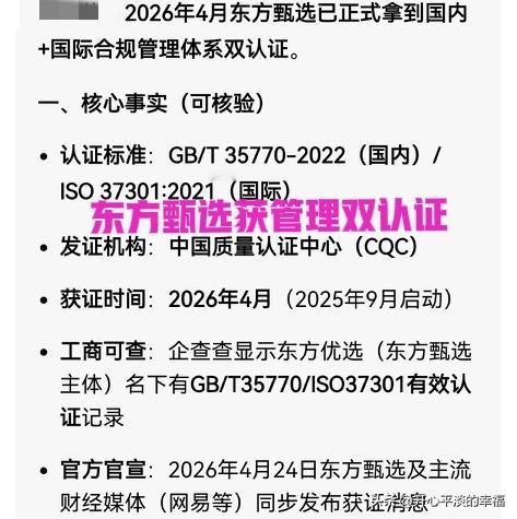 东方甄选的管理变了,变得太制度化,机械化,变得没有人情味了? 2026年4月东方甄选以明明为核心的四主播同时段官宣离职,他们的声明书里都提到了对公司新领导班子管理的质疑和不满。东方甄选的管理到底到底有多么不合规,让主播们集体离职吐槽? 在主播离职的当月,2026年四月东方甄选拿到了GB/T 35770-2022 / ISO 37301:2021 合规管理体系“国内+国际双认证”(中国国标+国际ISO标准),由中国质量认证中心发证。 管理从“人治”变“法治”。俞敏洪、孙进也说了不算了,公司统一规则,执行层更严格了,可能不像以前那么松散随意,不那么人情化了,突然的转变,习惯了随心所欲,自由自在的老主播们接受适应不了,东方甄选太没人情味了?! 对事不对人,讨伐的是制度,适者生存,别不适应就离开,事情翻篇了,个人去新的旅途实现人生价值,公司也要继续发展生存!彼此祝福吧!