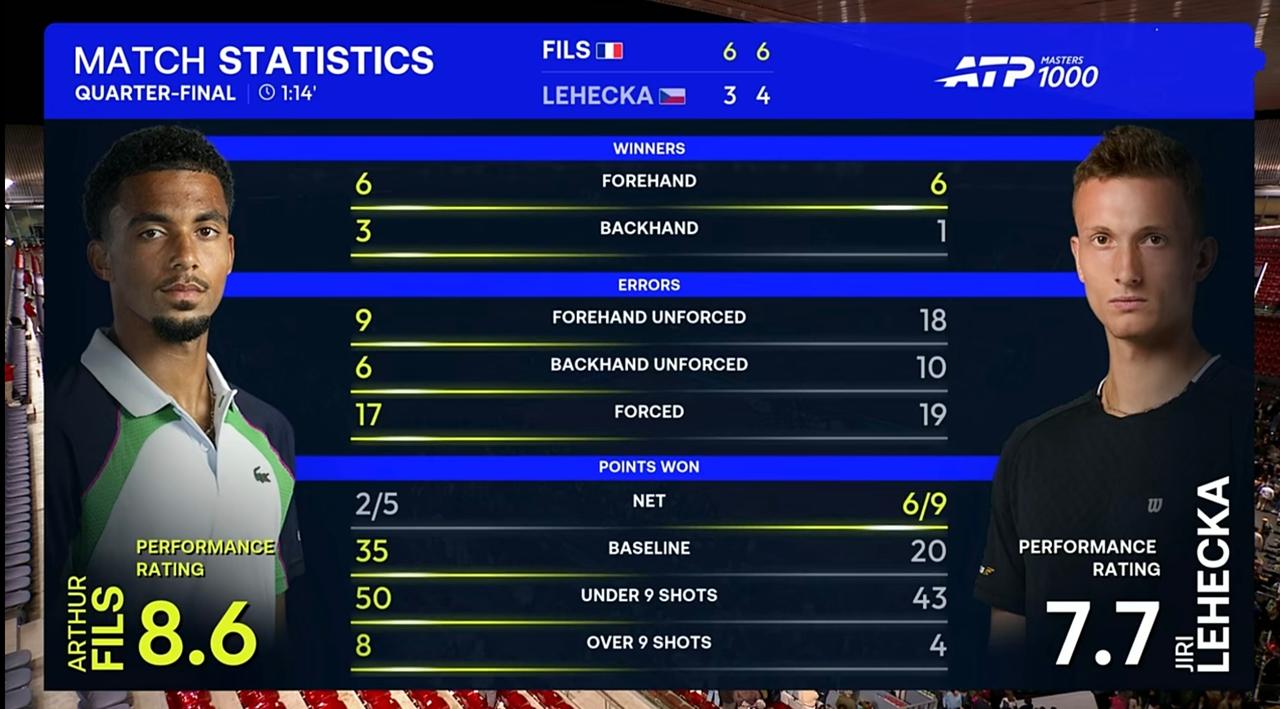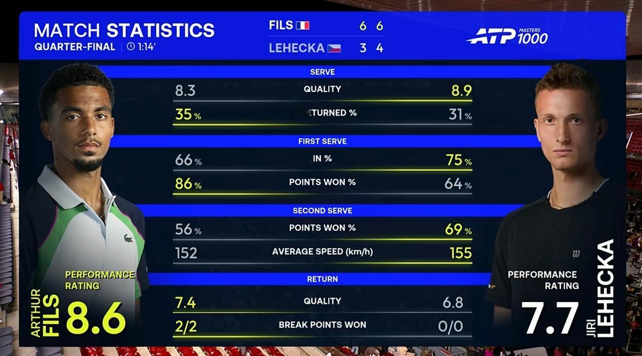 新生代菲斯马德里大师赛横扫莱赫奇卡,与辛纳会师半决赛 北京时间2026年4月30日凌晨,马德里大师赛1/4决赛,菲斯对阵莱赫奇卡。 结果,耗时1小时14分钟,菲斯以2:0的比分横扫莱赫奇卡,晋级四强。 具体比分为6:3、6:4。 整场比赛,菲斯共轰出2记ACE,比对手少4记;一发得分率高达85.71%,比对手高出21个多百分点;二发得分率55.56%,比对手低近14个百分点;共拿到2个破发点,比对手多2个;成功破发2次,比对手多2次;总得分58分,比对手多11分。 由于这场比赛的胜利,菲斯取得了职业生涯最长的9连胜,近成为目前法国排名最高的男网球员。 菲斯在本赛季出战的7项赛事中已6次闯入八强,大师赛第二次闯入四强。红土场上表现尤为稳定,此前还在巴塞罗那站夺得冠军,显示出对红土场地的极强适应力。 半决赛,新生代菲斯将挑战世界第一辛纳。辛纳在1/4决赛中以2:0的比分击溃了新生代霍达尔发起的猛烈冲击。
