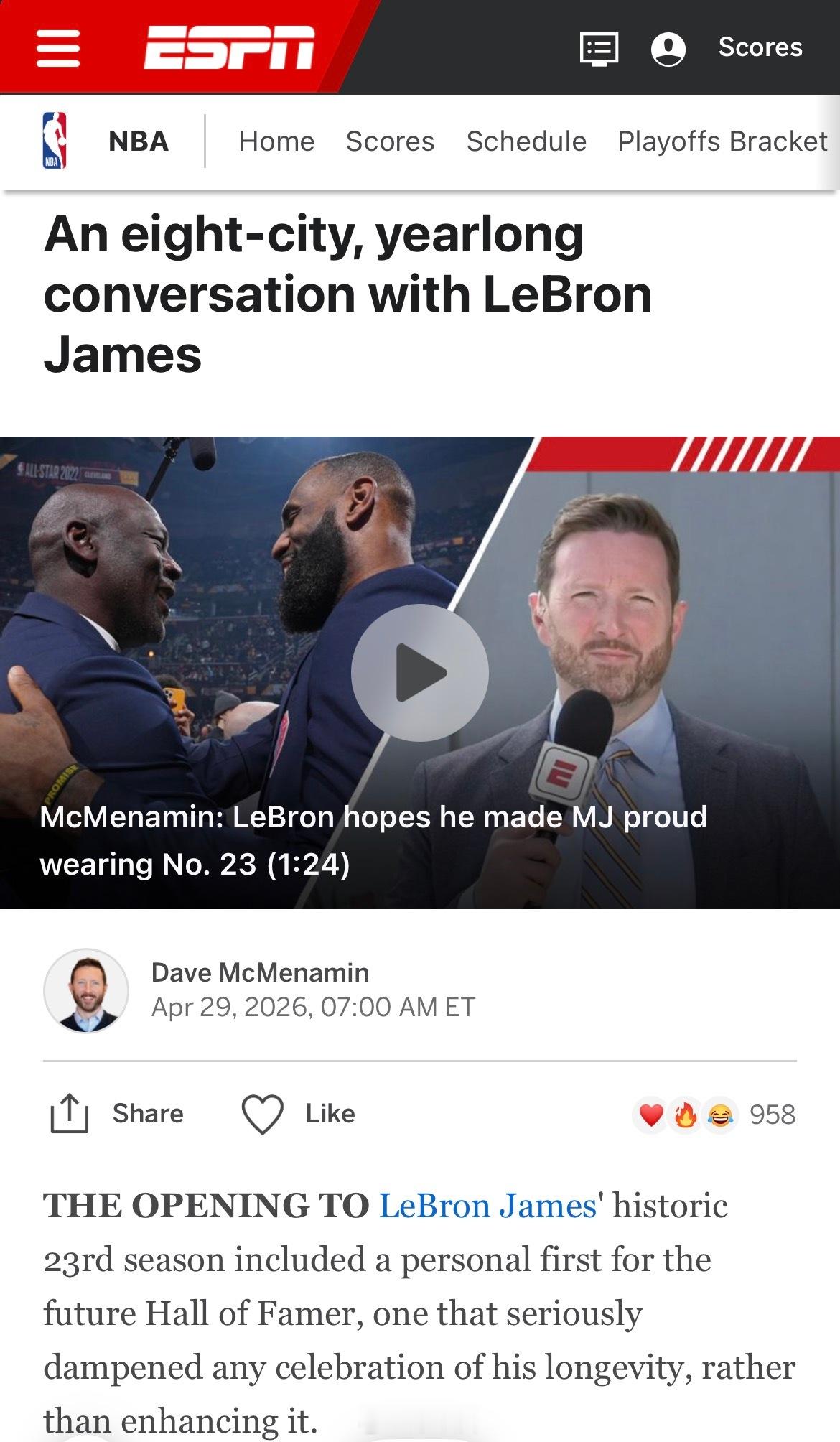 跟队报道詹姆斯十余年的ESPN记者戴夫·麦克马纳民,这赛季初和詹姆斯做了个约定,问他23个之前从来没有被问过的问题,这个专访策划持续了8座城市,最后问题数也超过了23,确实有很多幕后和细节。举一个例子,有一次跟影星莱昂纳多在比弗利山庄吃饭,也不知道是不是马弗里克·卡特安排的,他当时还没开始拍《好莱坞往事》,提前把计划都跟我说了,吃着吃着阿尔·帕西诺也来了……更多故事,大家可以通过英文原文去感受,包括他谈偶像乔丹网页链接
