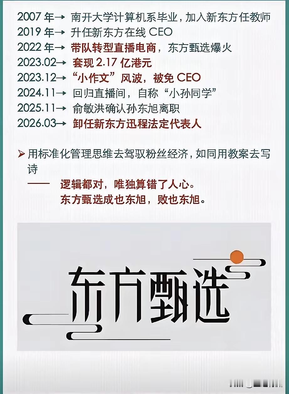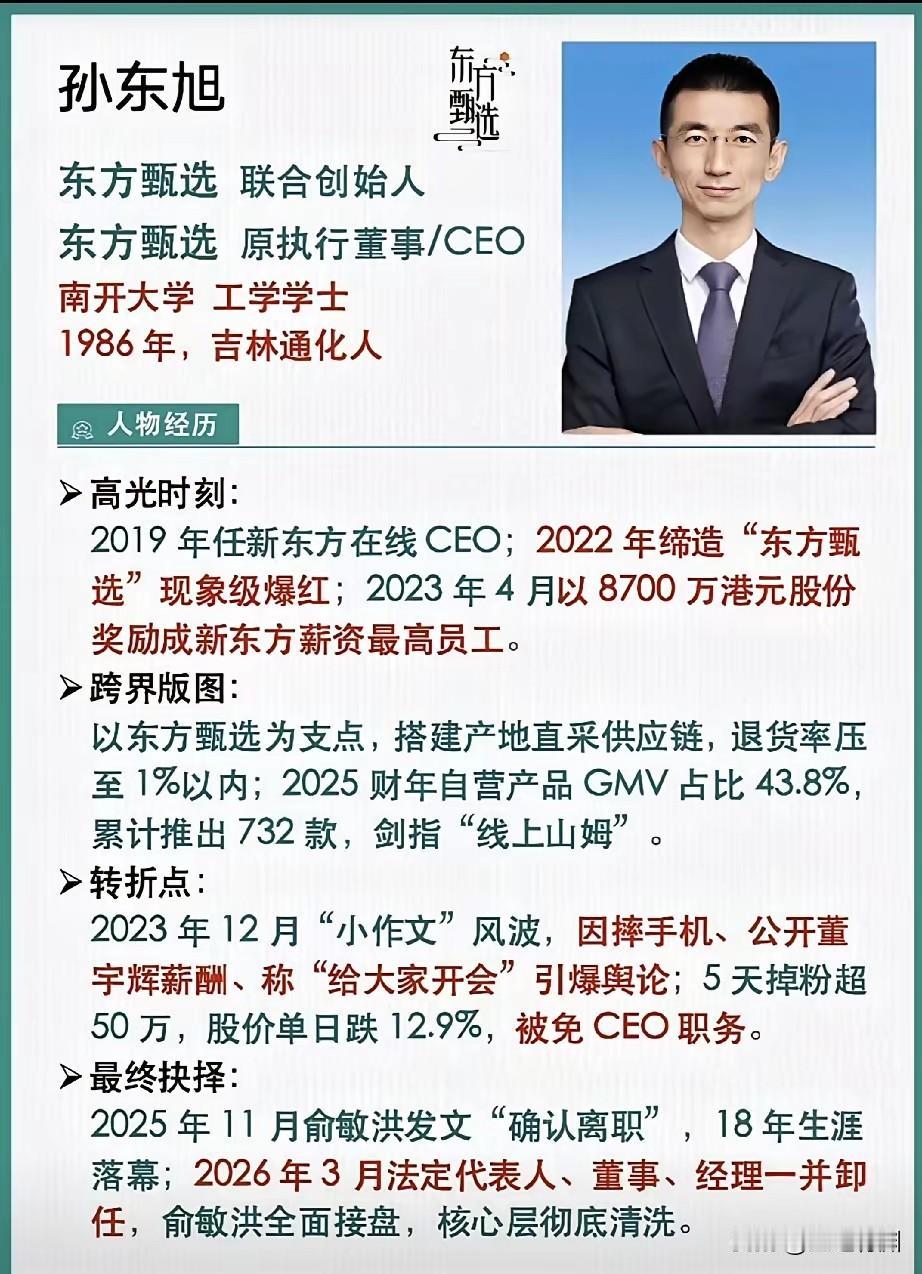 东方甄选那么多人离开,说明了公司管理存在的一些问题。从董宇辉开始跟小孙的一哥之争,矛盾激化选择离开自创与辉同行,到现在董宇辉和孙东旭全部离开。现在几个头部主播集体离职,说明大家对俞敏洪的不满。 其实这些谁谁谁都不重要,对于俞敏洪来说,企业员工来来往往很正常。有想走的,也有想来的。新东方从出国英语培训做起,成了上市公司,现在培训行业不行了,那些教英语课的老师们都被公司安排转行做了主播。时代变化让很多人不仅没丢掉饭碗,还变成了大家熟知的网红,收入比做教培不知道高多少倍! 这种模式,也是一样赚时代发展过程中的钱,但一样不会长久。人都是这样,只要有了钱,心态就会不一样的。不管老板还是员工[比心] 但实在想不通,他们短期能赚那么多钱💰