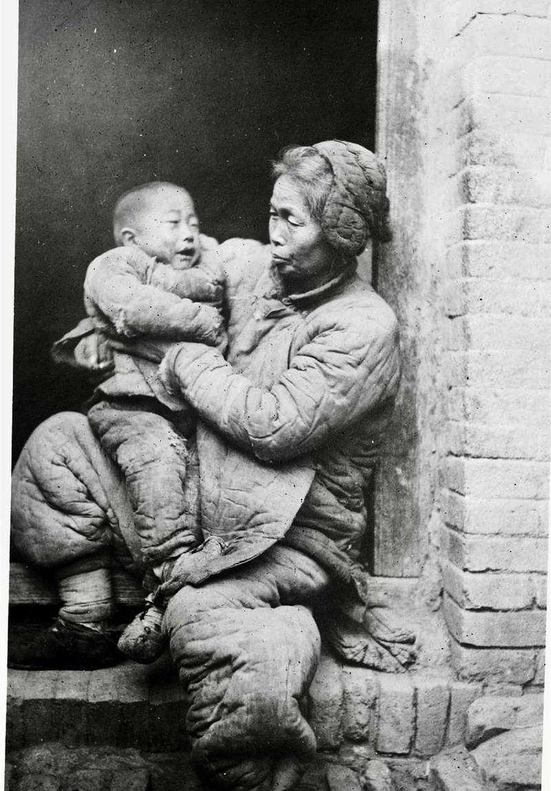 1922年,北京一户穷苦人家母子在自家门洞石阶上,母亲抱着孩子倚坐在石墙上,两人都裹着臃肿破旧的棉衣,棉絮从磨损的布料里翻出,补丁层层叠叠,早已看不出原本的针脚与颜色,厚重的棉服反而衬得母子俩的身影格外单薄。 母亲的棉帽压着蓬乱的头发,脸上刻着被生计磨出的疲惫与麻木,她的双臂用力环住怀里的孩子,像是要把仅存的暖意都裹进这小小的身躯里;而孩子穿着同样破旧的棉袄,小脸苍白,嘴唇微张,眼神里带着不安的茫然,瘦小的身体陷在厚重的棉服里,分明是长期饥饿与营养不良留下的痕迹,连哭闹的力气都被匮乏的日子磨去了大半。