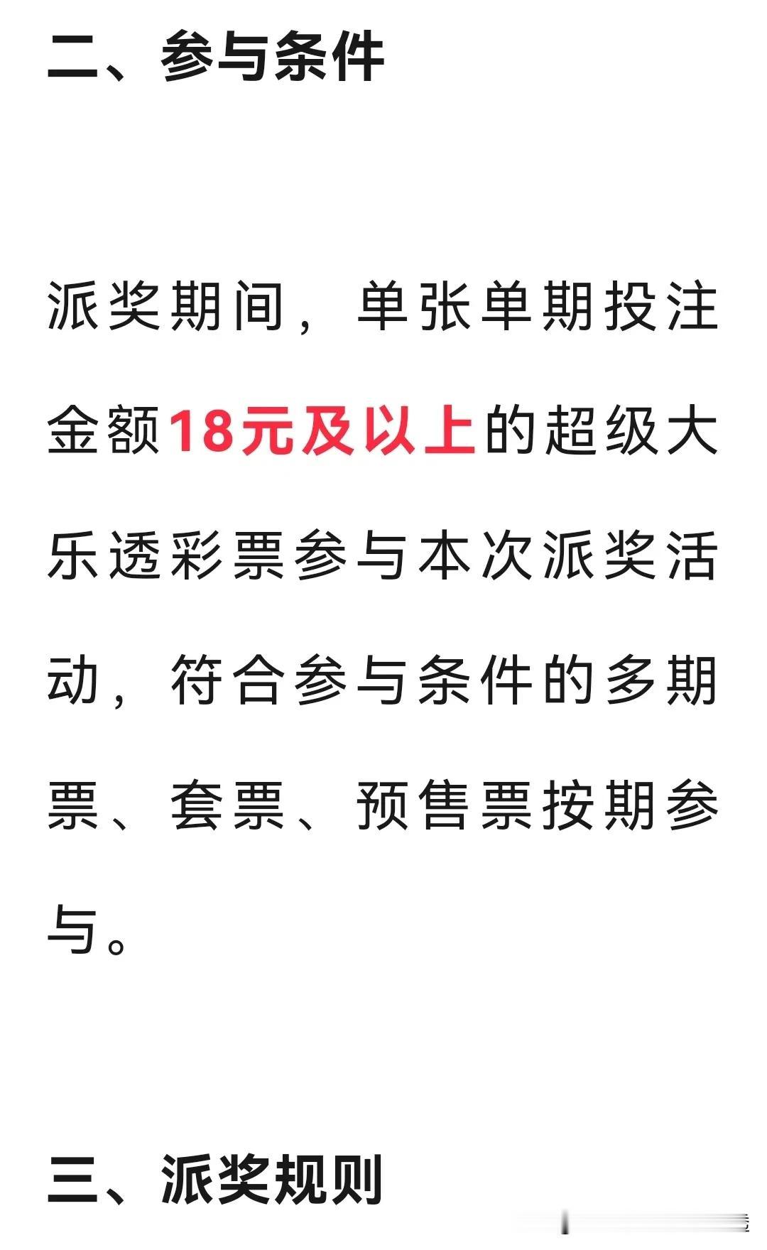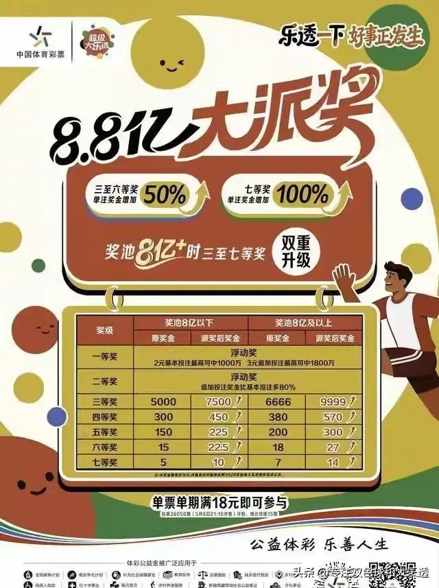 体彩大乐透8.8亿派奖活动是真的,我一开始还以为真假难辨的呢! 刚看到体彩微信公众号发布通告,自体彩大乐透26050期开始,单票满18元以上就能参与派奖活动,预计大概持续15期左右,一二等奖不参与此派奖活动。 不知道大家看到此消息,第一个想法是什么呢?