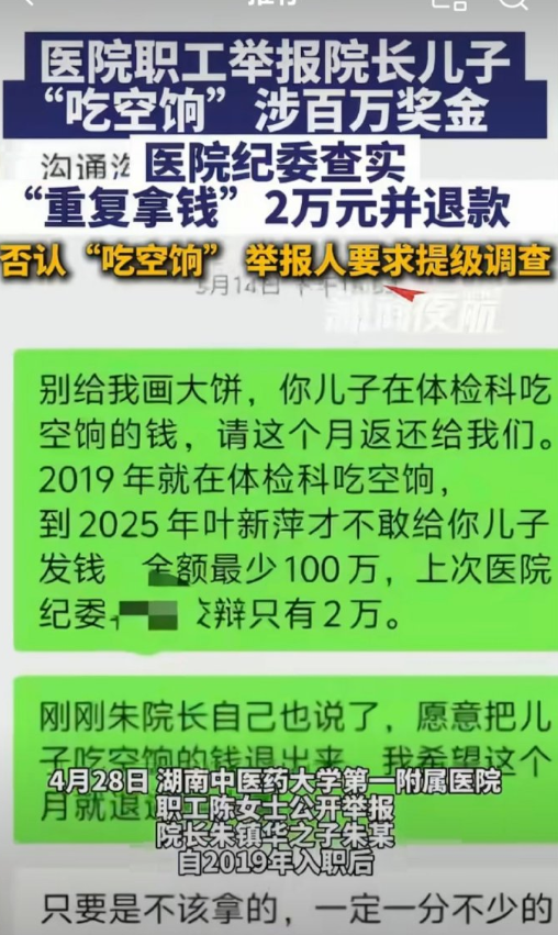 举报人:院长儿子从未在编制所在科室上班,却在另一个科室,六年估算奖金超百万。 纪委调查结论:他2022年调科后,在原科室“重复拿了”4笔共2万元,已退款。 院长回应:不存在吃空饷,已由纪委调查清楚。