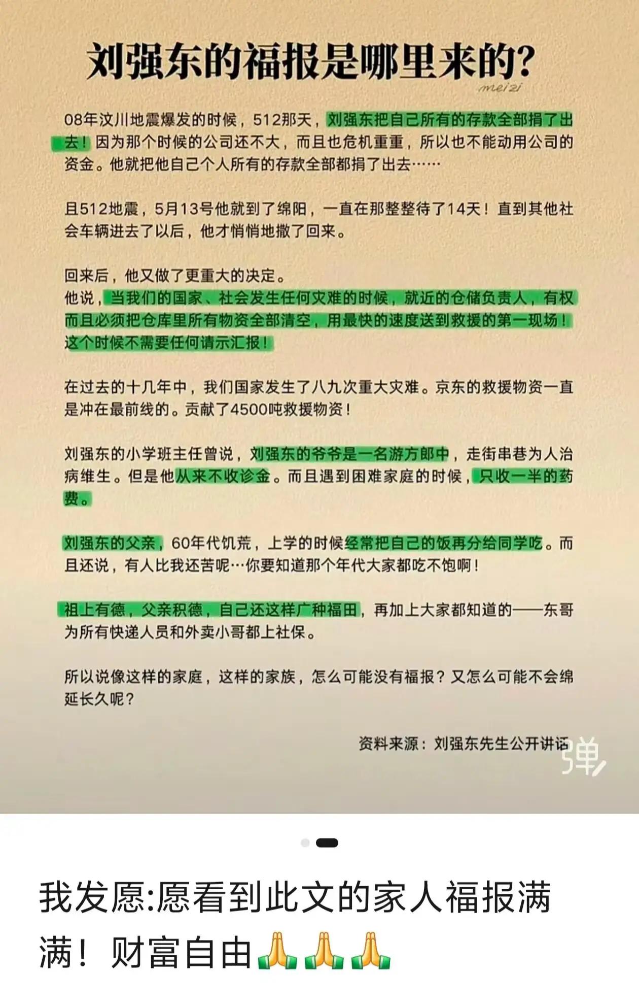 不少人说,刘强东的福报,是祖上给的! 老话讲“积善之家,必有余庆”!刘强东能有今天,36岁前靠祖上积德,36岁后全是自己修来的! 老家宿迁农村,以前穷得吃不饱饭。但他家世代心善:爷爷是乡村郎中,翻山越岭看病不收诊费,穷人药钱都减半 ;父亲饥荒年把口粮分给别人,自己饿肚子。最难得是,自家都难,还收养了农村苦女孩当亲女儿养,这份善良没几个人有 ! 后来他发达了,从没忘本:每年给老家村民发年货、红包,给老师发奖金;灾难面前,京东物资永远第一个冲前线,十几年捐了4500吨物资;几十万快递员,他坚持全交社保。 祖上的福分早用完了,现在的好运,全是他知恩图报、广积善缘换来的。