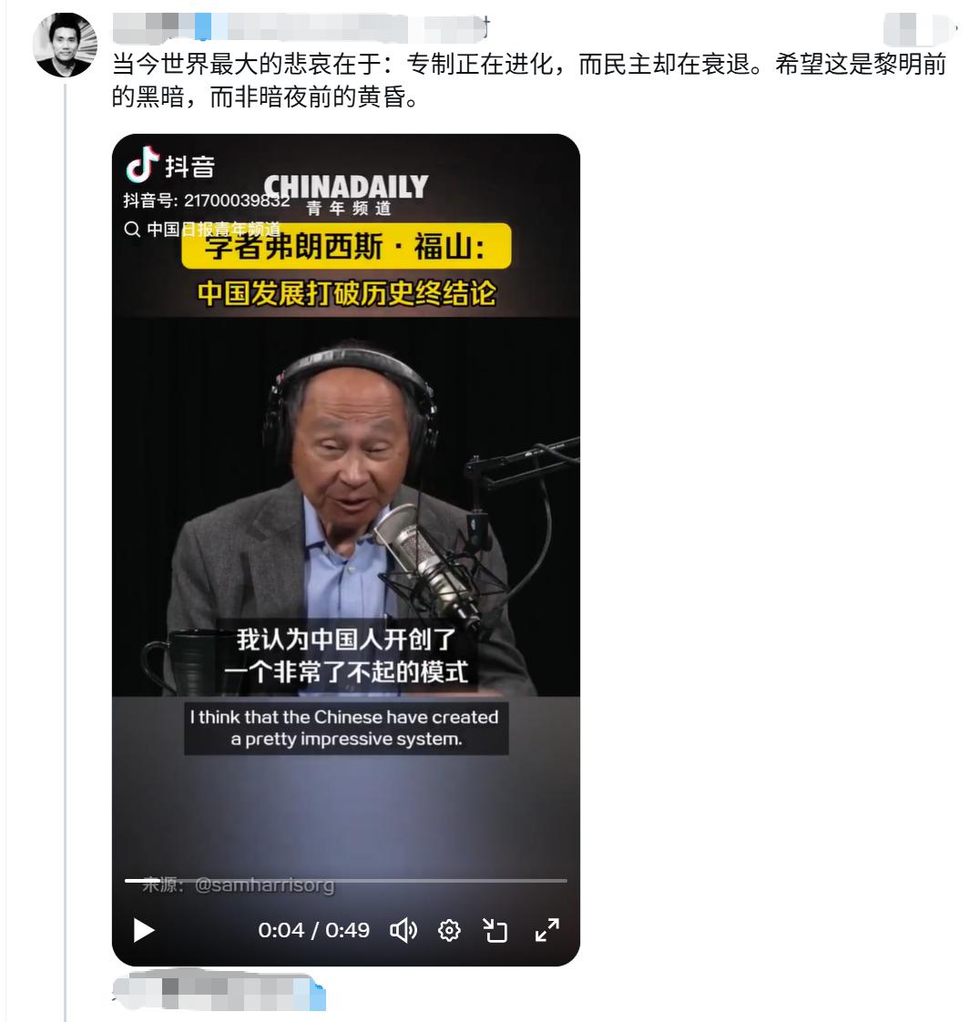 美国学者佛朗西斯说:中国人开创了了不起的模式,而美国的民主自由在分崩离析。润人看后很不爽,哀嚎道:当今世界最大的悲哀在于,专职正在进化,而民主却在衰退,希望这是黎明前的黑暗,而非暗夜前的黄昏。 评一句:不要活在幻想中,不要执拗,要认清现实,认清历史发展大势。
