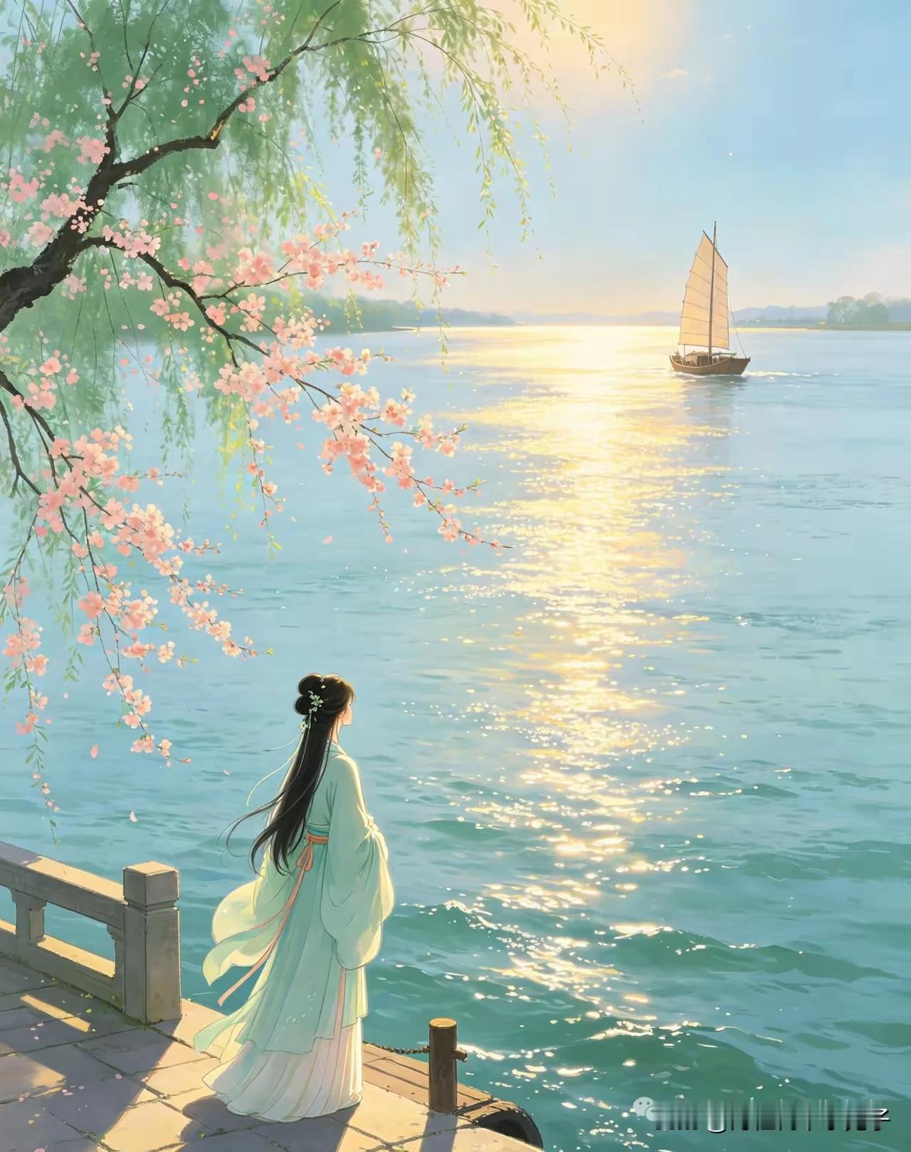 晨光初染半江红, 夹岸桃花映碧空。 一棹轻舟分晓色, 扬帆远航迎春风。