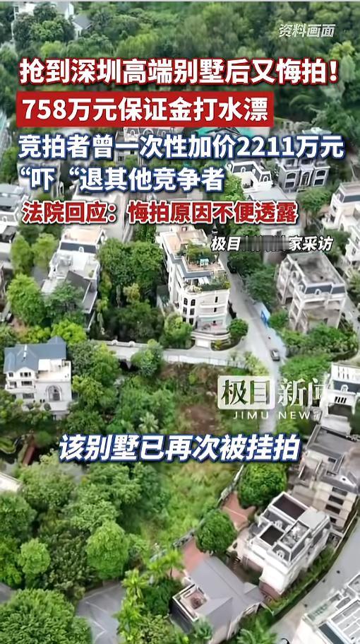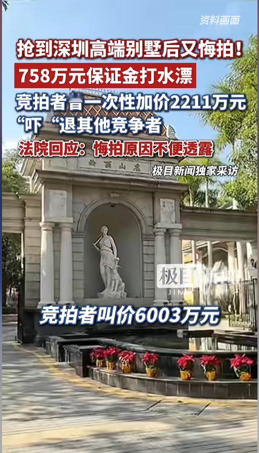 “七百多万打了水漂?”4月29报道,广东深圳,一高端别墅被法拍,刚开始很冷清,无人出价,结果一位竞拍者突然加价2211万,将别墅推到6003万高位,顺利中标,可没想到他竟又悔拍了。758万保证金也退不了,白白扔了!网友:里面有道道! 据媒体报道,被法拍的别墅位于西丽山庄,评估价5400多万,起拍价不到3800万,每次加价才18.9万。今年3月10号的时候,这座别墅在阿里法拍平台挂牌拍卖。 可没想到,刚开始拍卖的时候,都没有人出价,氛围十分冷清。到了第二天,终于有一位竞拍者出价了。可没想到,就在他出价后一分钟,又一位竞拍者出了价,他一口气加价了2211万。 这一举动“吓”退了其他竞拍者,后续没有一个人愿意出价,就这样,该竞拍者以6003万的高价,成功竞拍。可没想到,到了要交尾款的时候,他却不干了,选择了悔拍。 到了4月27日,最后期限已过,当地法院确认本次交易未被履行,竞拍者所付758万余元保证金,依法予以没收,不予退还。同时,该竞拍者也被禁止参与后续的竞拍活动。 消息传出后,不少人看的迷迷糊糊,758万,就这么不要了?有钱人的世界,看不懂!后来,有网友做出推测,此次竞拍者可能是原房主找来的托,为了提高房价,反正保证金最后也是用于优先偿还债务,被没收了也不亏。可一旦拍出高价,那就是血赚! 不少网友也认同了这种说法,但没有官方的确切消息,不知道各位看官,对此怎么看呢?欢迎大家评论区讨论。 信息来源:《