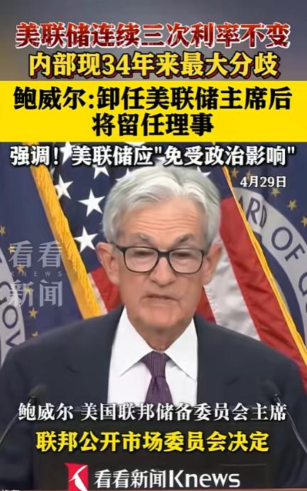 谁能想到,美联储这波直接把“内部矛盾”摆上了台面,利率连续躺平三次就算了,投票吵到破了34年纪录,连鲍威尔都不走寻常路,卸任主席后非要留在理事位上,摆明了要跟某些势力硬刚到底! 4月29日的议息会议刚落幕,美联储官宣利率继续原地踏步,这已经是今年第三次纹丝不动。 可真正炸翻市场的,是那组离谱的投票数据:8票赞成维持利率不变,4票直接投了反对票,一举创下1992年以来的最高反对票纪录! 有人急得跳脚,喊着要立刻降息25个基点;有人死咬不放,连半句松口的话都不让说,生怕通胀再窜上天,两派吵得快掀了桌子。 更让人摸不着头脑的,是鲍威尔的反常操作,他直接公开表态,自己卸任美联储主席后,不像历任主席那样直接退休走人,非要留任理事到2028年才罢休。 嘴上说着“为了让美联储免受政治影响”,可明眼人都能看出来,这哪是单纯的坚守岗位,分明是用打破几十年惯例的方式,给外界划下了一道红线,谁也别想把手伸进美联储。 其实这事的根儿,还是美国经济现在彻底陷入了两难,物价没降干净,油价时不时就往上跳一下,就业和消费又没垮台,降息怕通胀反扑,不降息又有人喊经济扛不住。 美联储里的两派,一个盯着通胀死磕,一个盯着经济喊救命,吵到最后,连主席都得亲自下场镇场子。 说到底,从这破了纪录的分裂投票,到鲍威尔反常的留任操作,都藏着美联储现在的拧巴。 利率动也不是,不动也不是,内部吵得四分五裂,连主席都得打破惯例硬刚,接下来每一次议息会议,估计都得是一场大戏,就看他们什么时候能吵出个结果了! 信息来源:看看新闻knews《美联储连续三次利率不变内部现34年来最大分歧鲍威尔:卸任美联储主席后将留任理事》 2026年4月30日报道