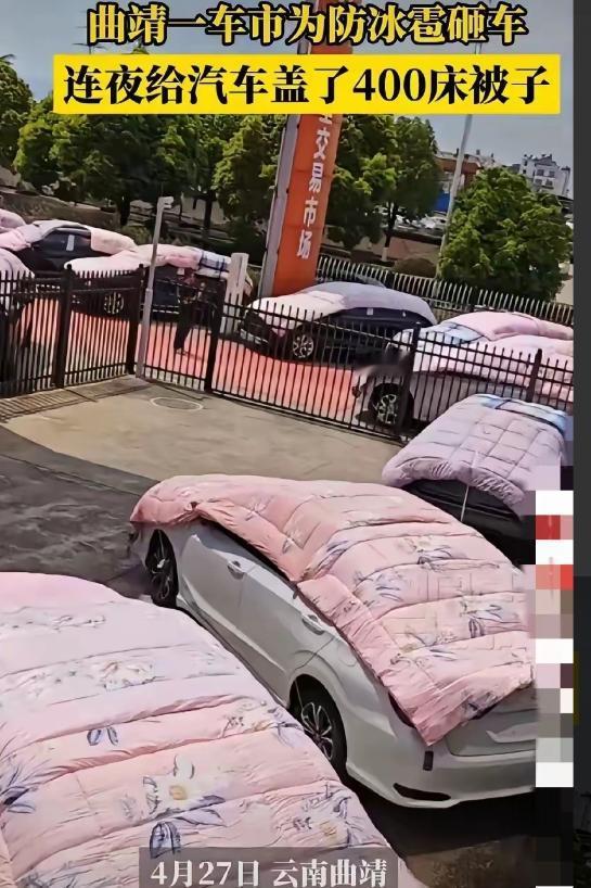 这才是有“被”无患!4月29日九派快讯报道,云南曲靖,有家汽车经销商,连夜囤了 400 条棉被,大伙本以为是给员工发福利,没想到竟是拿来给新车盖着防护,网友调侃:云南十九怪,汽车盖被卖! 大家都听过“云南十八怪”,但就在前两天,云南曲靖又闹出了个“第十九怪”,被网友们编成顺口溜到处传,叫作“汽车盖着被子卖”。 4月27号,曲靖麒麟区的金豆二手车交易中心,路过的人打老远一看,还以为这车行要给员工发福利呢,结果走近一瞧,好家伙,院子里停着的一百多台亮闪闪的新车,全都“穿”上了粉红色的厚棉被。 车顶、车头、车屁股被裹得严严实实,远远望去,就像一排排整齐躺在外面睡觉的小婴儿,那场面既壮观又带着几分滑稽,让人看了忍不住想笑。 很多人刚看到网上的视频时,第一反应就是:这商家太会炒作了吧?为了红真是什么招都使得出来,给车盖车衣的见过,给车盖棉被的还是头一回见,这也太夸张了。 可实际上,这真不是为了博眼球,而是被老天爷逼出来的,车行的负责人陈先生说,他们这么做完全是为了防冰雹。 原来,最近这段时间云南的天气特别反常,尤其是东部和南部,动不动就来场强对流天气,又是打雷又是暴雨。 就在前不久,昆明嵩明等地刚下了一场大冰雹,那冰雹大的跟鸡蛋一样,落在地上“砰砰”响,当时很多停在露天的车可遭了殃,车顶被砸得满是坑,挡风玻璃碎得像蜘蛛网,车灯也瞎了,修一下少说也得好几万。 陈先生一看这阵势,心里立马犯了嘀咕,他这有一百多台刚到的新车,展厅里早就塞满了,剩下的只能停在露天院子里。 这些车价值不菲,要是真遇上鸡蛋大的冰雹,那可就全毁了,别说卖不出去,就算花钱做了无痕修复,那也成了“修复车”,价格得大打折扣,而且卖给消费者心里也过意不去,那是对客户不负责任。 想来想去,他决定用个最原始、最“笨”,但绝对最管用的法子:盖棉被,说干就干,4月26号那天,他紧急采购了三四百条厚棉被。 当天晚上十点多了,全公司的员工都没下班,大家齐心协力连夜给车“盖被子”,每辆车基本上都要叠上三层厚棉被,车顶和引擎盖这些重点部位更是护得死死的,最后还得用绳子一圈一圈捆紧,就怕半夜起大风把被子给吹跑了。 在汽车行业干了11年的员工晏先生感叹说,这辈子也是头一回见这种阵仗,以前虽然也防冰雹,但多半是小打小闹,这次看预报说有“鸡蛋大”,那是真不敢大意。 他给大伙算了一笔账:一台车配三床棉被,成本也就三百块钱左右,可要是被砸坏了,换块原装玻璃就得两三万,再加上漆面修复,那钱花起来跟流水一样,相比之下,买棉被这点钱简直太划算了,这叫花小钱办大事。 这些“粉红小公主”一样的汽车在院子里一停,立马成了网红打卡点,网友们在评论区里也炸开了锅,有的调侃说:“这才是正儿八经的有‘被’无患,老板真是个逻辑鬼才!” 有的说:“粉色被子配上新车,这违和感里居然透着一丝可爱。”更多的网友则是竖起大拇指点赞,觉得这老板是个实在人,不整那些虚头巴脑的营销,是用实实在在的行动在保护车子,对未来的买主负责。 现在这些棉被还盖在车上,陈先生打算至少盖到4月底,等这波极端天气过去了再拆。 说到底,这事看着挺逗,其实背后透着一股子智慧,现在很多商家为了出名,整天琢磨怎么搞花哨的噱头,结果往往是昙花一现。 反倒是曲靖这家车商,用了最土的办法,解决了最实在的问题,这400条棉被,不仅挡住了可能掉下来的冰雹,还给店里挡出了一个好名声,真是一举多得。 这也给大伙提了个醒:在天灾面前,办法土点没关系,只要能保住财产、守住诚信,那就是最好的招。 对此你怎么看? 信源:九派快讯