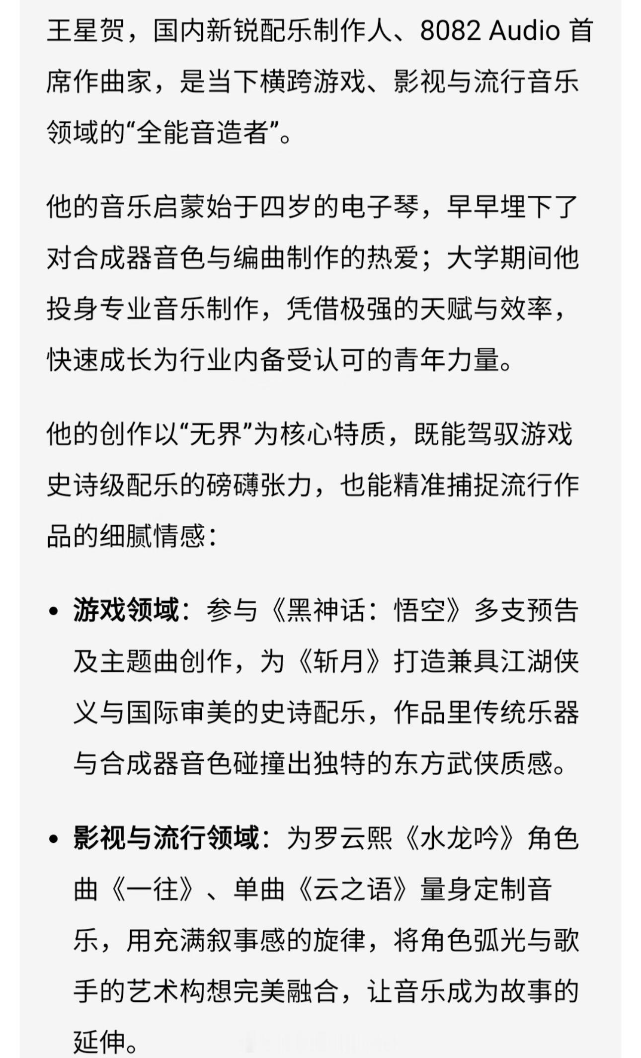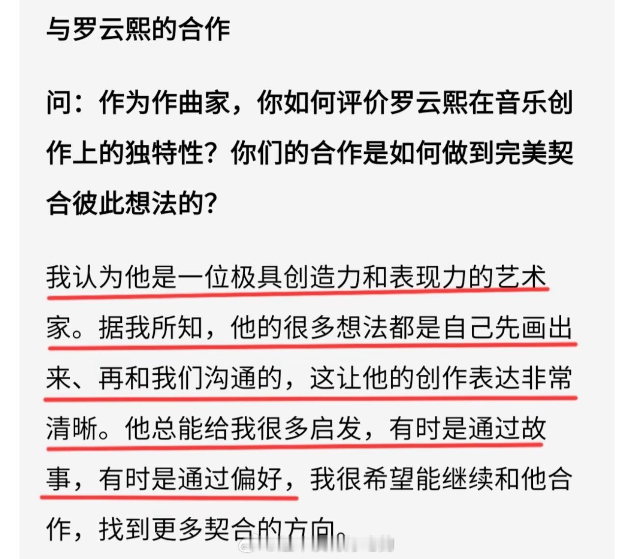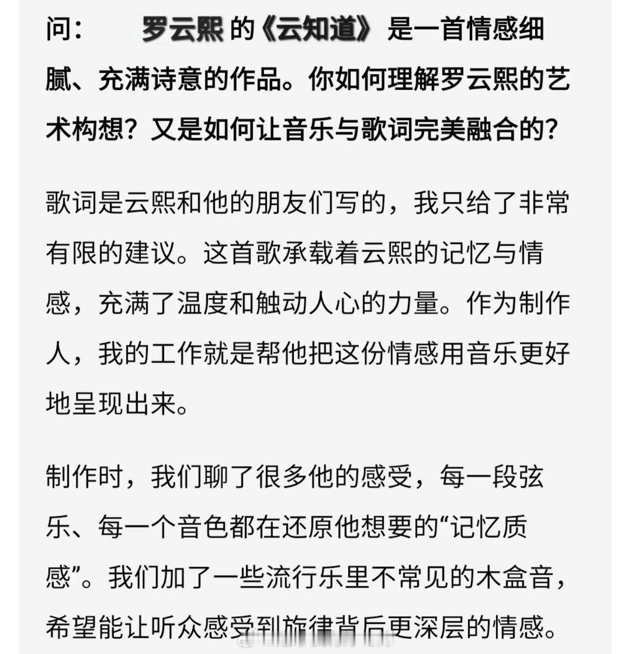 和罗云熙合作过的音乐制作人王星贺外媒采访提到的罗云熙盛赞罗云熙是一位极具创造力和表现力的艺术家。罗云熙罗云熙