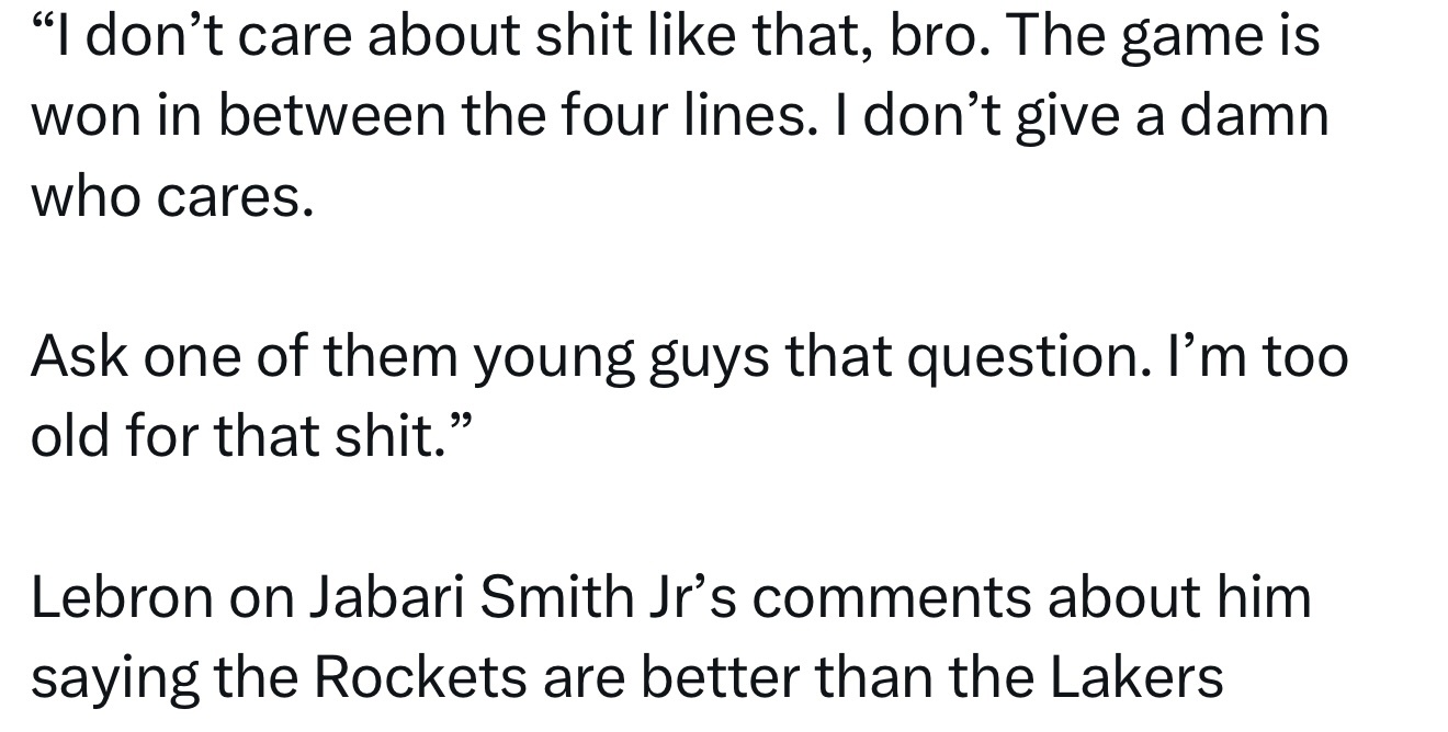 詹姆斯回应贾巴里·史密斯关于“火箭队比湖人队更强”的言论时表示: