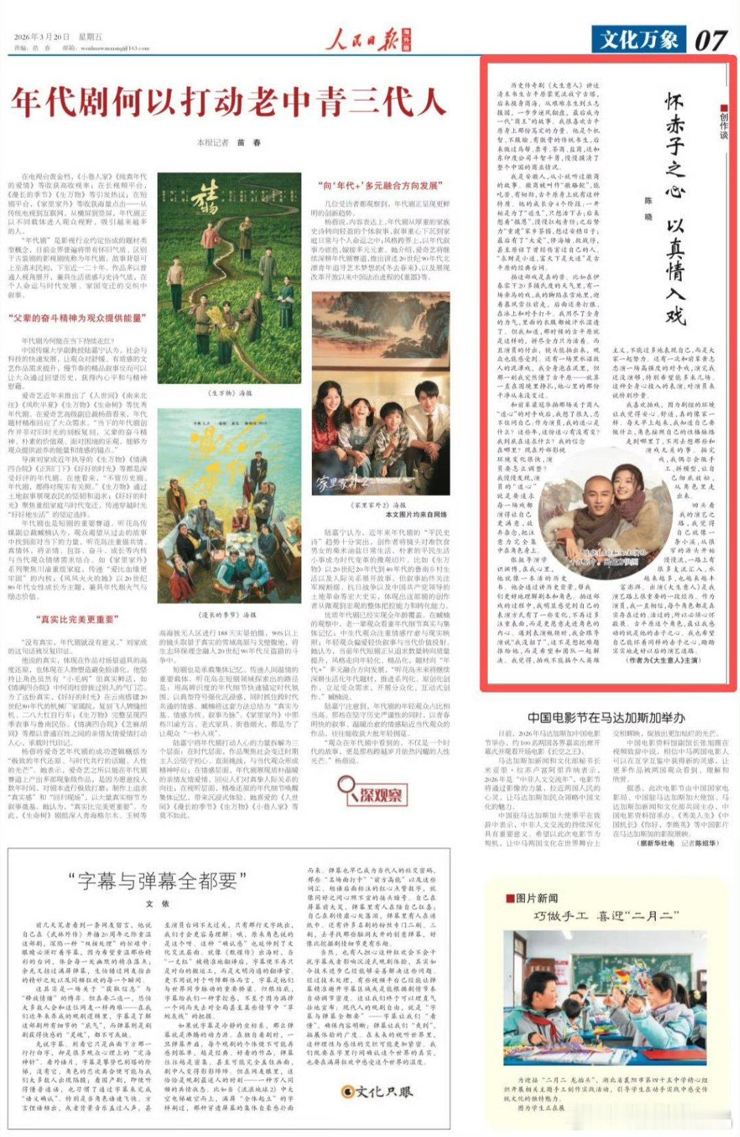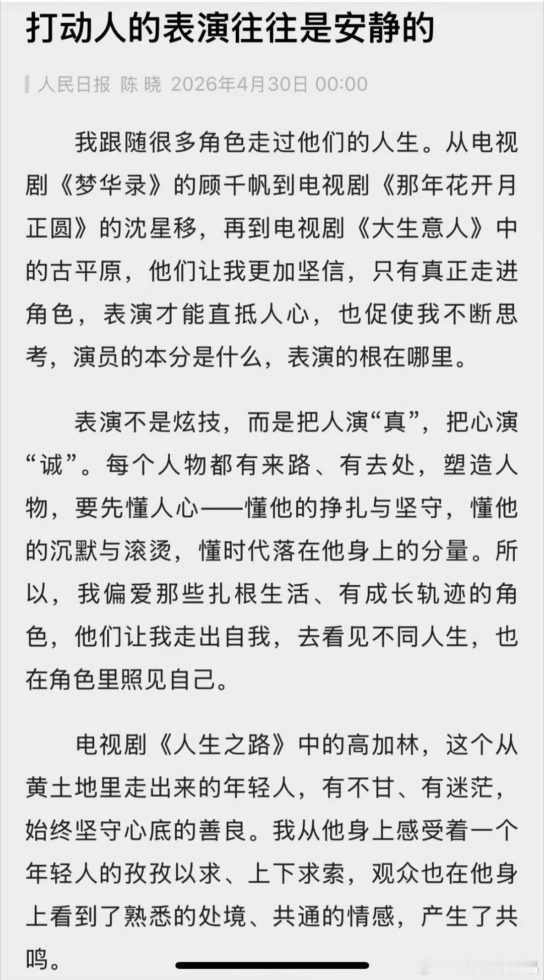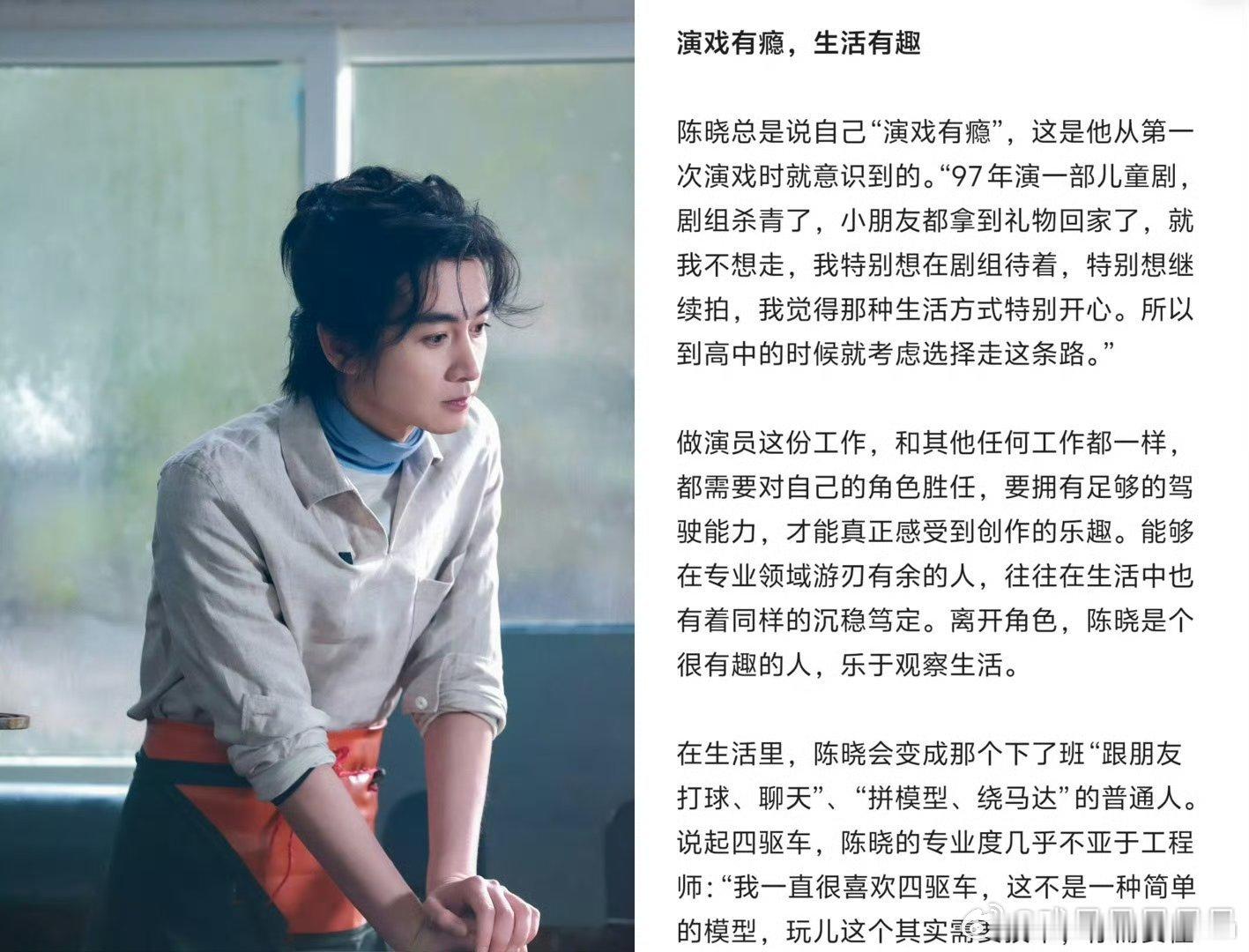 演员陈晓人民日报撰文看得出来,陈晓是真的热爱演戏,喜欢待在剧组。