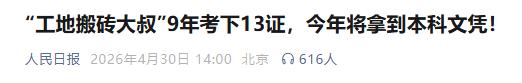 太励志了!一位常年在工地搬砖的大叔,没有优越的学习条件,没有充足的空闲时间,全靠挤时间、拼毅力,用9年时间硬生生考下了13本证书,涵盖各类技能证书,如今他再进一步,今年就将顺利拿到本科文凭,用努力改写自己的人生,网友直呼普通人的逆袭太动人。 今年6月,一位51岁的工地大叔将迎来人生重要时刻,他将顺利拿到国家开放大学土木工程专业的本科毕业证书,为自己9年的坚持,画上又一个圆满的句号。没人能想到,这个即将拥有本科学历的人,曾是个初中没毕业、日薪只有100元的工地小工。 如今的他,早已不是当年那个只能干搬砖、清理垃圾杂活的工人,而是手握13本专业技能证书,负责四十多个工地安全隐患排查的安全监督员,月薪过万,每天在各个工地之间奔波,守护着工地的安全。 他来自河南商丘,9年前,为了撑起家里的重担,照顾年迈的父母和三个上学的女儿,他告别老家,跟着老乡来到浙江杭州的建筑工地打工,把妻子留在老家照料家人,自己独自在外打拼。 刚到工地时,他干着最苦最累的杂活,每天重复着繁重的体力劳动,收入微薄。但他不甘心一辈子靠卖力气谋生,深知光靠体力活撑不了几年,便下定决心,利用休息时间学习,考证书、提学历,改变自己的命运。 他的学习之路没有捷径,每天在工地干完活,浑身酸痛、疲惫不堪,却依然坚持拿出书本和电脑学习,常常学到深夜。没有优越的学习条件,他就用手机听课、记笔记,把碎片化时间全部利用起来,哪怕是工地休息的间隙,也会拿出知识卡片背诵。 9年前,他迈出了考证的第一步,决定向当电工的哥哥学习,考取电工证。2500元的培训费,相当于他当时半个多月的工资,面对生疏的理论知识,他格外吃力,却没有放弃,一页页苦读,一字字抄录,最终如愿拿到了建筑电工证。 拿到电工证后,他的工资从4000多元涨到7500元,但他没有停下脚步。他想成为工地安全员,而考证需要中专学历,初二就辍学的他,又开始挑战学历考试,2020年顺利通过中专考试,拿到安全生产考核合格证书。 应聘安全员时,他因实践经验不足被拒绝,却没有气馁,虚心向老乡请教,积累实践经验,半年后成功应聘安全员,后来又跳槽到安全技术服务公司,完成了从体力工人到技术管理者的转型。 9年间,他一路逆袭,从中专读到大专,再到即将拿到本科文凭,先后考取了建筑电工、二级建造师、监理工程师等13本证书,远超工作所需,每一本证书都凝聚着他的汗水和坚持,如今51岁的他,还在备战10月的注册安全工程师考试。 他不仅自己坚持学习,还带动工地上32位河南老乡一起考证、提升学历,帮助他们摆脱体力劳动,转型成为建筑安全领域的管理人员。他的日子依旧忙碌,却始终没有停下学习的脚步,用9年时间,改写了自己的人生轨迹。 对此,你们有什么看法,欢迎评论留言~